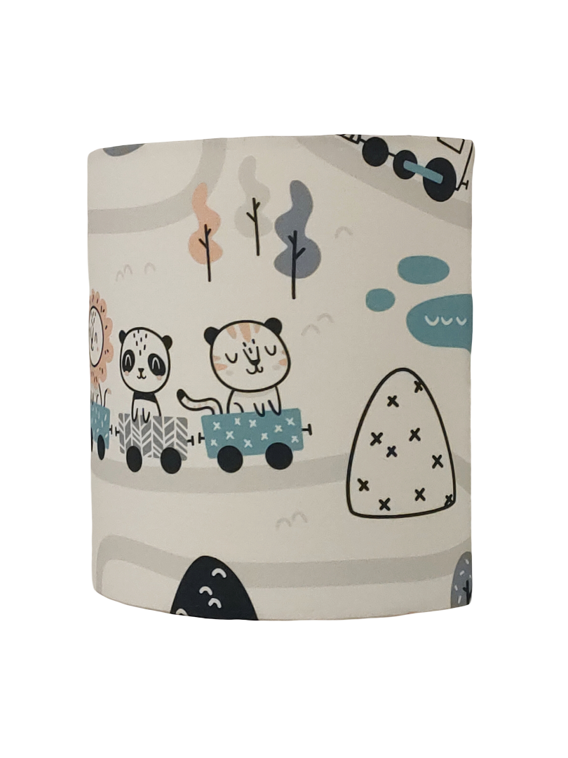 Les Appliques Murales sont réalisées à partir d'une carcasse métallique demi-cylindrique finition peinture époxy blanche recouverte de tissu 100% coton certifié OEKO TEX (sans produit chimique) motifs imprimés le train des animaux de la jungle ( panda - lion - tigre) contrecollé sur un polyphane ignifugé blanc (PVC non inflammable).