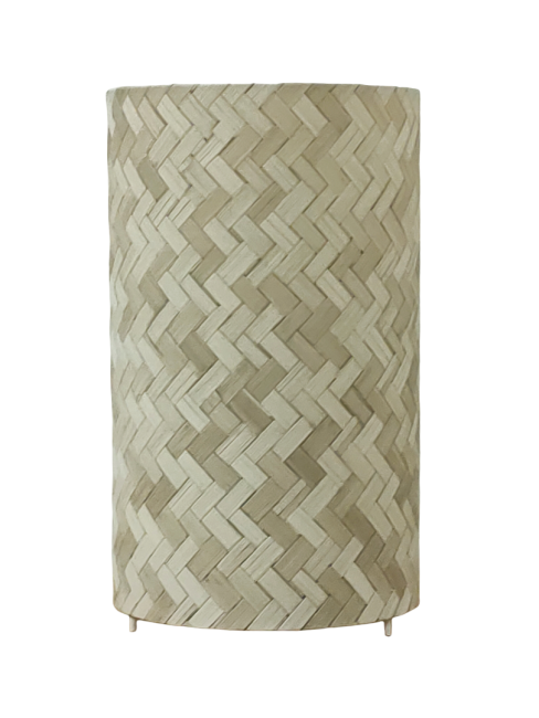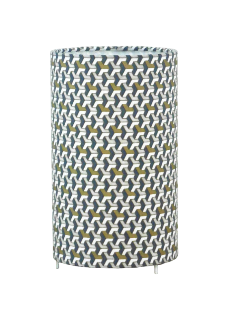 La lampe tube est réalisée à partir d'une carcasse métallique avec pieds finition époxy blanche recouverte de tissu 100% coton certifié OEKO TEX (sans produit chimique) motifs imprimés géométriques - doré contrecollé sur un polyphane ignifugé blanc (PVC non inflammable).