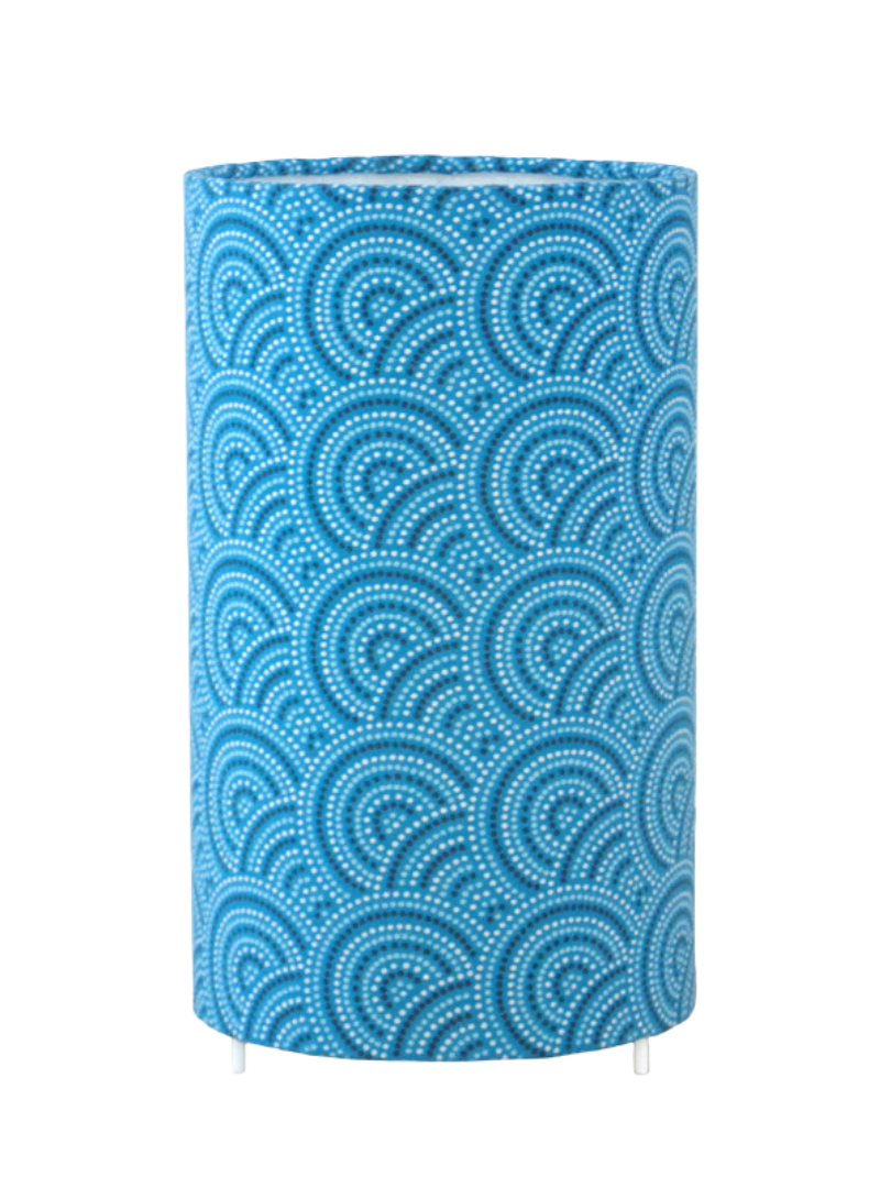 La lampe tube est réalisée à partir d'une carcasse métallique avec pieds finition époxy blanche recouverte de tissu 100% coton certifié OEKO TEX (sans produit chimique) motifs imprimés Aborigènes bleus contrecollé sur un polyphane ignifugé blanc (PVC non inflammable).