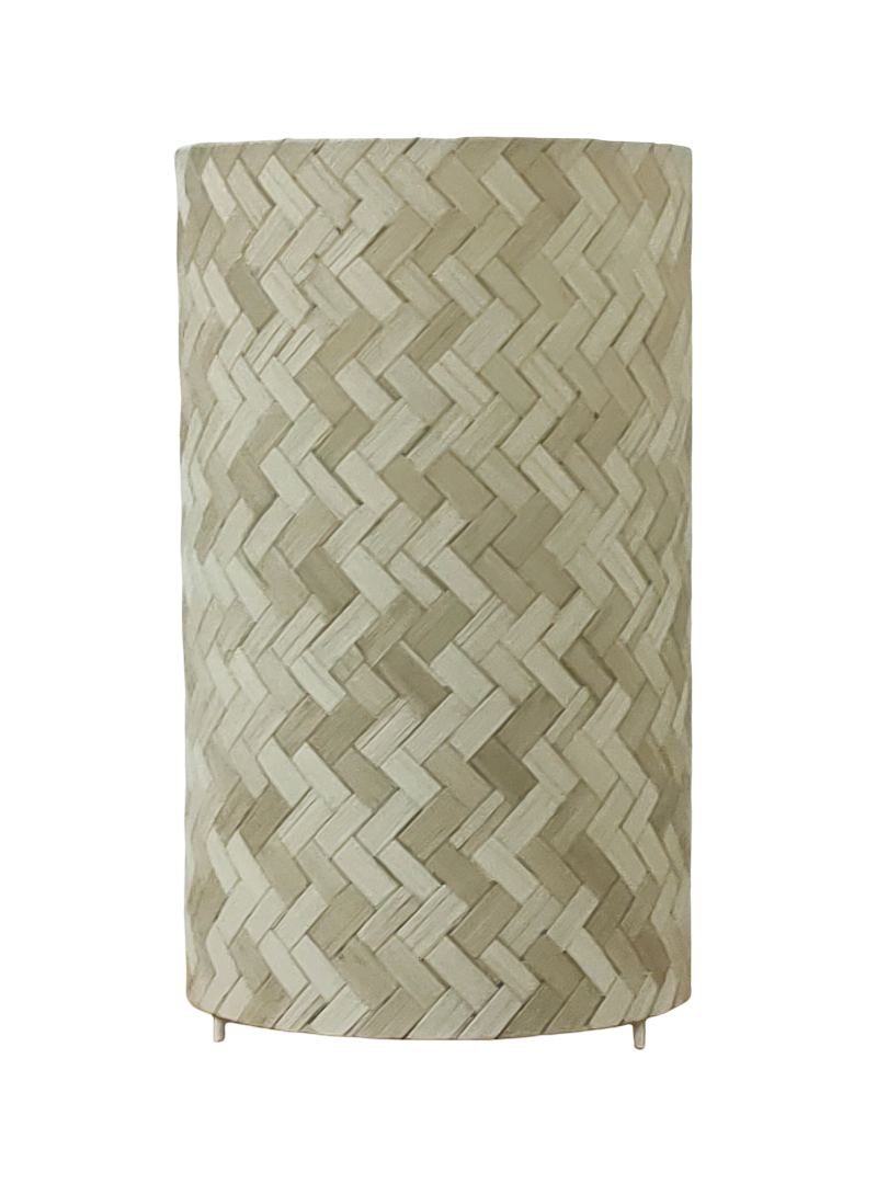 La lampe tube est réalisée à partir d'une carcasse métallique avec pieds finition époxy blanche recouverte de papier intissé imprimé motifs trompe l'oeil cannage - natte en osier contrecollé sur un polyphane ignifugé blanc (PVC non inflammable).