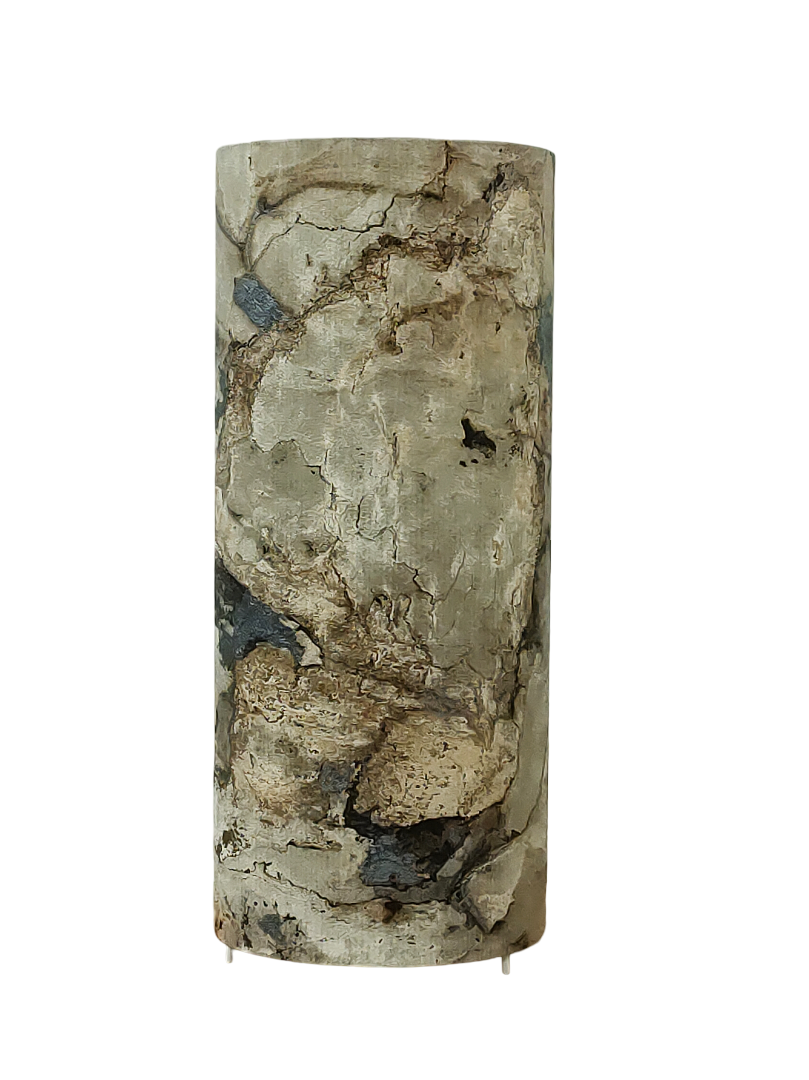 La lampe tube est réalisée à partir d'une carcasse métallique avec pieds finition époxy blanche recouverte de papier intissé imprimé motifs Minéral contrecollé sur un polyphane ignifugé blanc (PVC non inflammable).