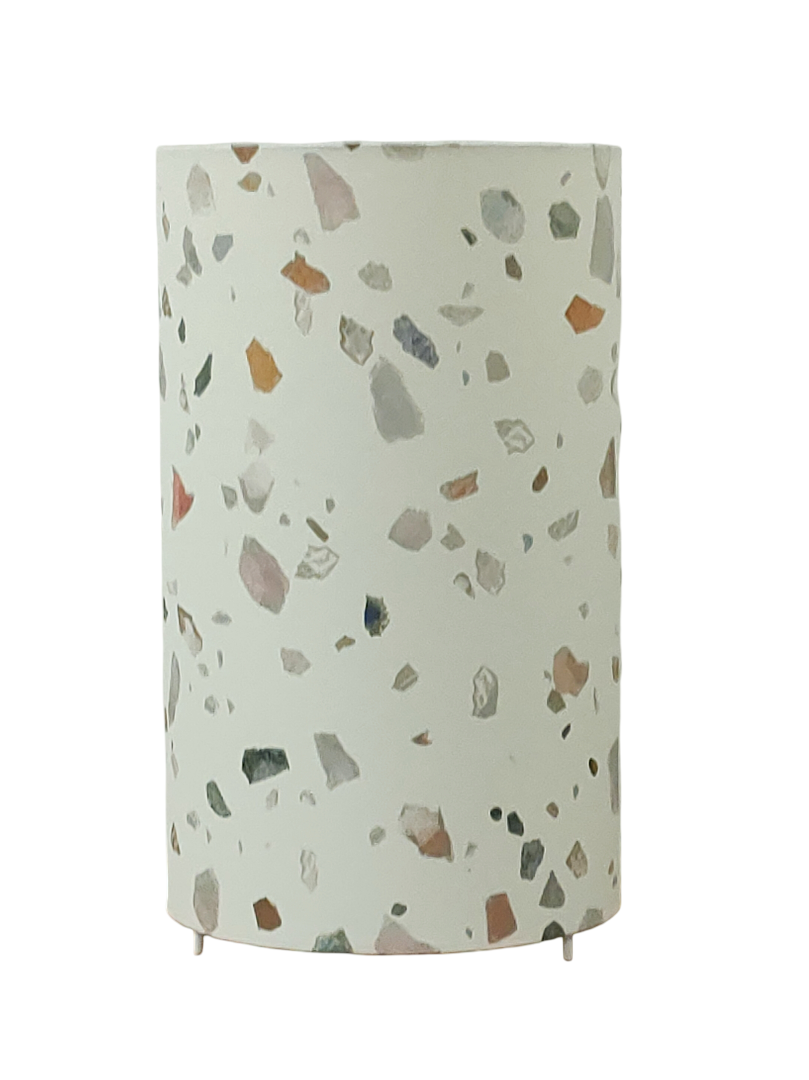 La lampe tube est réalisée à partir d'une carcasse métallique avec pieds finition époxy blanche recouverte de papier intissé imprimé motifs Terrazzo contrecollé sur un polyphane ignifugé blanc (PVC non inflammable).