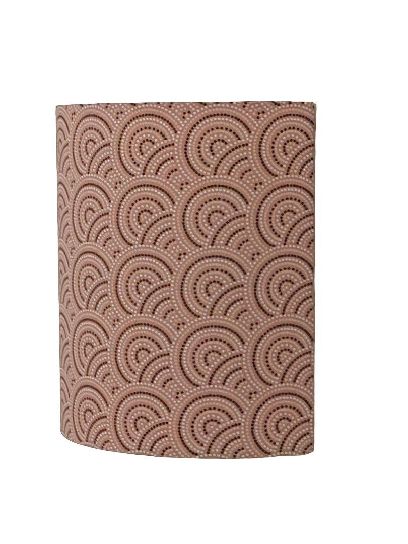 Les Appliques Murales sont réalisées à partir d'une carcasse métallique demi-cylindrique finition peinture époxy blanche recouverte de tissu 100% coton certifié OEKO TEX (sans produit chimique) motifs imprimés Aborigènes roses contrecollé sur un polyphane ignifugé blanc (PVC non inflammable).
