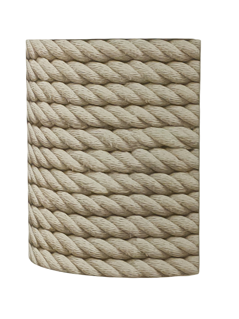 Les Appliques Murales sont réalisées à partir d'une carcasse métallique demi-cylindrique finition peinture époxy blanche recouverte de papier intissé imprimé motifs Cordage contrecollé sur un polyphane ignifugé blanc (PVC non inflammable).