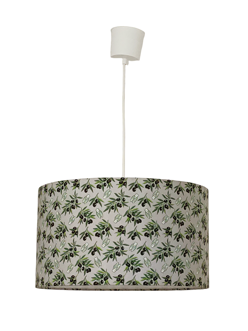 La suspension abat-jour est réalisée à partir d'une carcasse métallique finition époxy blanche recouverte de tissu 100% coton certifié OEKO TEX (sans produit chimique) motifs imprimés provençaux - Olives et cigales contrecollé sur un polyphane ignifugé blanc (PVC non inflammable).