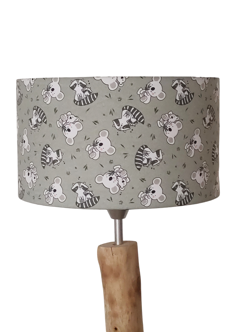 L’abat-jour est réalisé à partir d'une carcasse métallique finition époxy blanche recouverte de tissu 100% coton certifié OEKO TEX (sans produit chimique) motifs imprimés koalas et ratons laveurs contrecollé sur un polyphane ignifugé blanc (PVC non inflammable).
