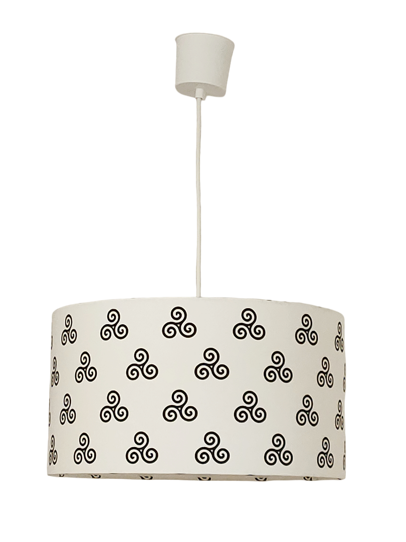 La suspension abat-jour est réalisée à partir d'une carcasse métallique finition époxy blanche recouverte de tissu 100% coton certifié OEKO TEX (sans produit chimique) motifs imprimés Celte - triskel - Bretagne - croix bretonne - Breizh contrecollé sur un polyphane ignifugé blanc (PVC non inflammable).
