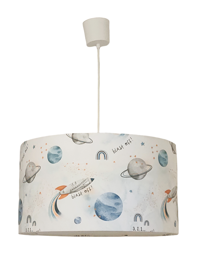 La suspension abat-jour est réalisée à partir d'une carcasse métallique finition époxy blanche recouverte de tissu 100% coton certifié OEKO TEX (sans produit chimique) motifs imprimés L'espace (fusées, planètes, étoiles, arc-en ciel) contrecollé sur un polyphane ignifugé blanc (PVC non inflammable).