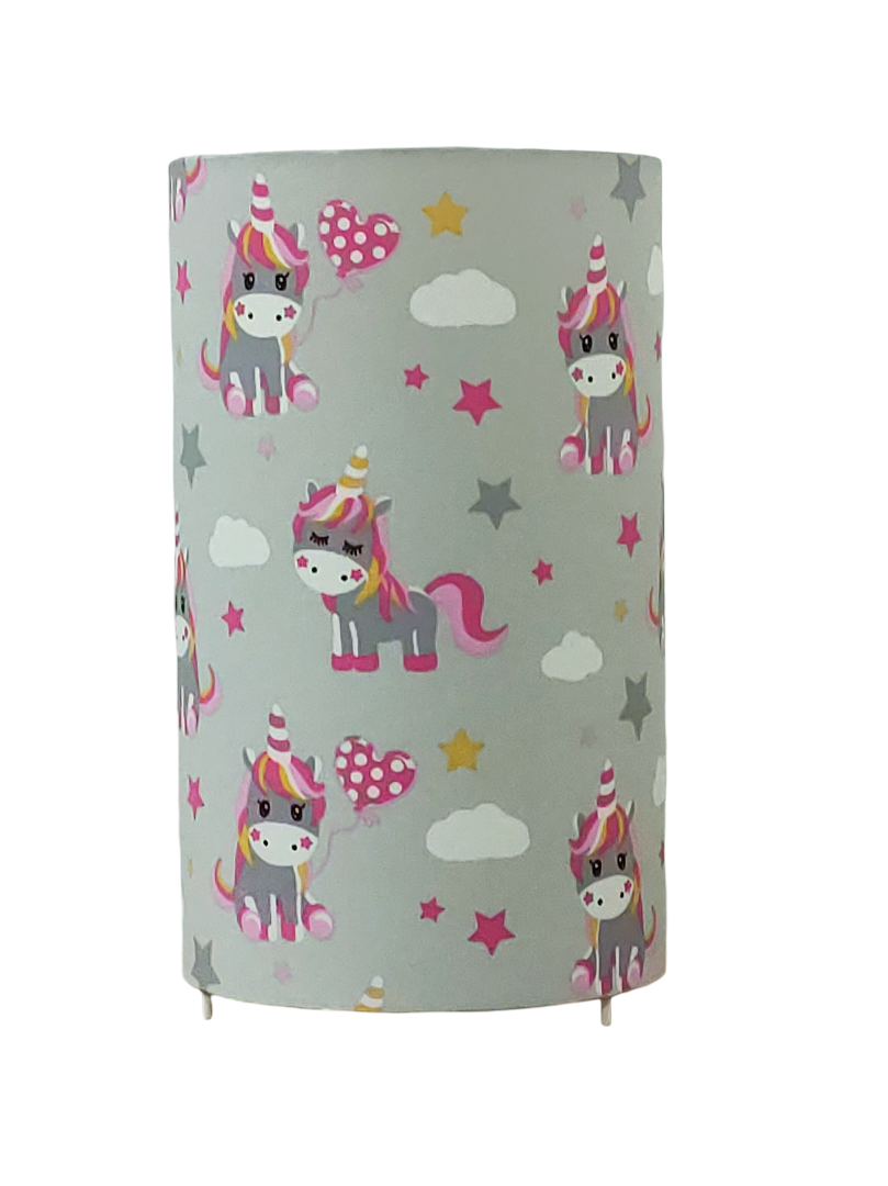 La lampe tube est réalisée à partir d'une carcasse métallique avec pieds finition époxy blanche recouverte de tissu 100% coton certifié OEKO TEX (sans produit chimique) motifs imprimés Licornes contrecollé sur un polyphane ignifugé blanc (PVC non inflammable).
