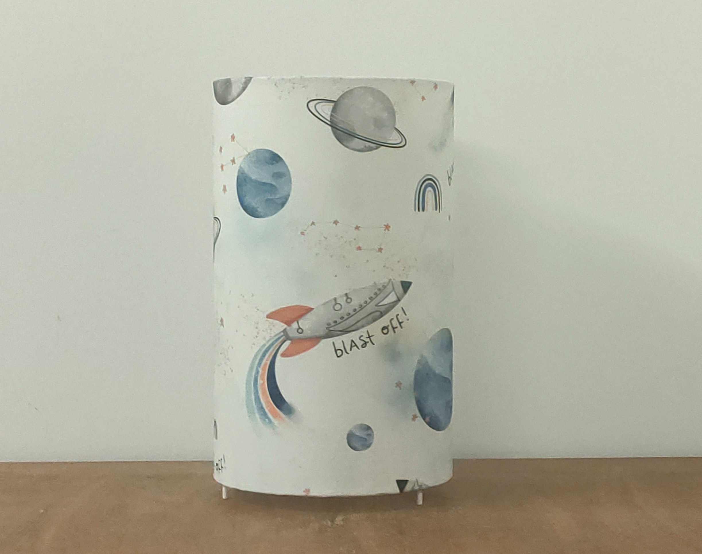 La lampe tube est réalisée à partir d'une carcasse métallique avec pieds finition époxy blanche recouverte de tissu 100% coton certifié OEKO TEX (sans produit chimique) motifs imprimés L'espace (fusées, planètes, étoiles, arc-en ciel) contrecollé sur un polyphane ignifugé blanc (PVC non inflammable).