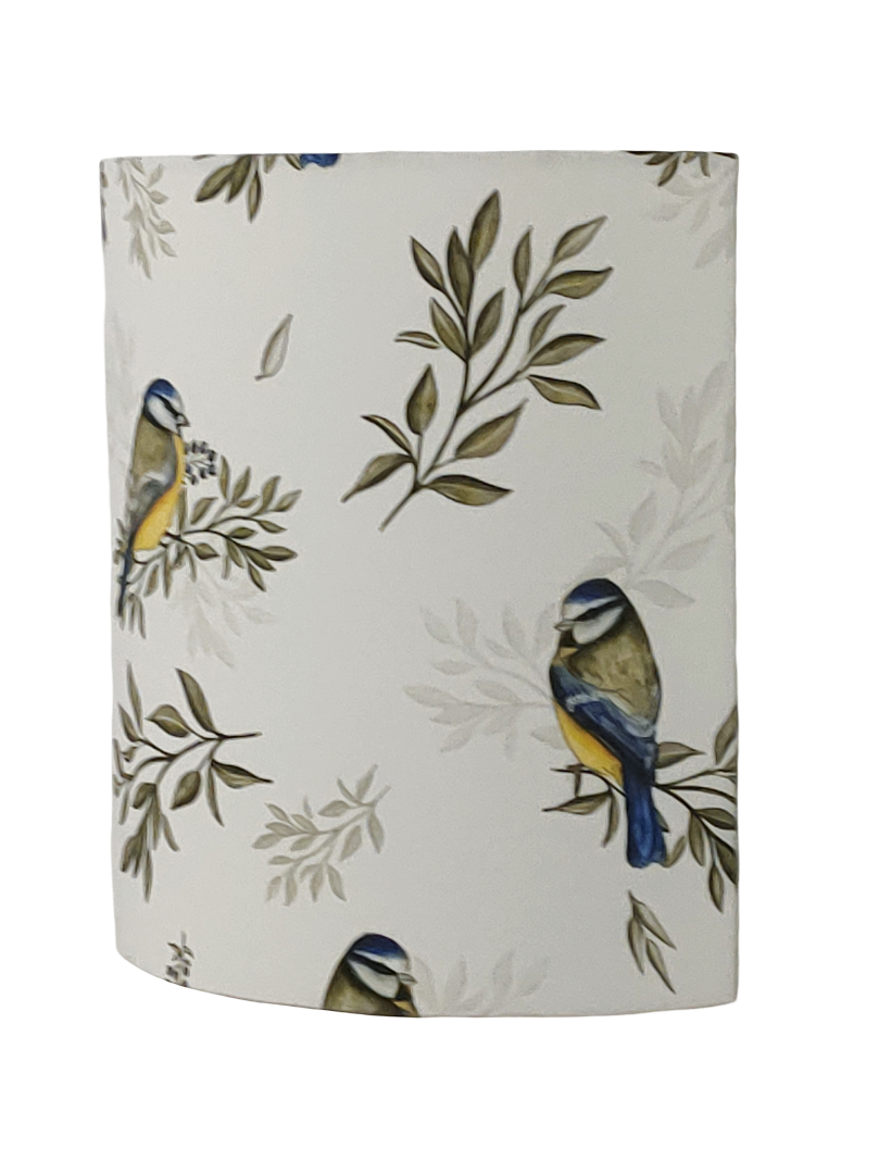 Les Appliques Murales sont réalisées à partir d'une carcasse métallique demi-cylindrique finition peinture époxy blanche recouverte de tissu 100% coton certifié OEKO TEX (sans produit chimique) motifs imprimés oiseaux - mésanges contrecollé sur un polyphane ignifugé blanc (PVC non inflammable).