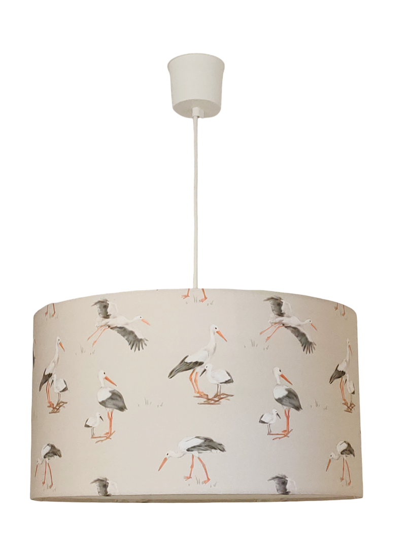 La suspension abat-jour est réalisée à partir d'une carcasse métallique finition époxy blanche recouverte de tissu 100% coton certifié OEKO TEX (sans produit chimique) motifs imprimés cigognes contrecollé sur un polyphane ignifugé blanc (PVC non inflammable).