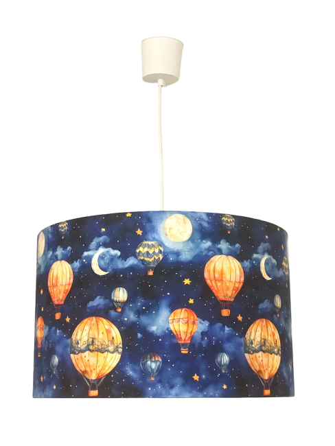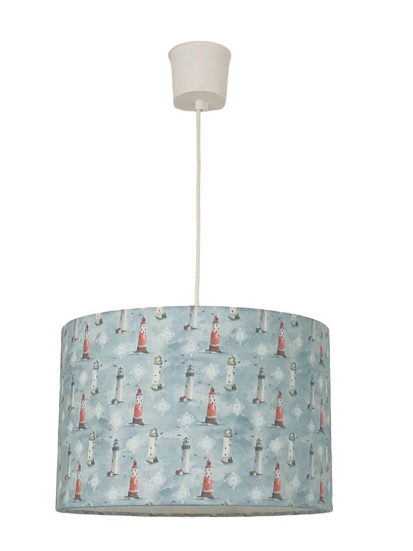 La suspension abat-jour est réalisée à partir d'une carcasse métallique finition époxy blanche recouverte de tissu 100% coton certifié OEKO TEX (sans produit chimique) motifs imprimés phares contrecollé sur un polyphane ignifugé blanc (PVC non inflammable).