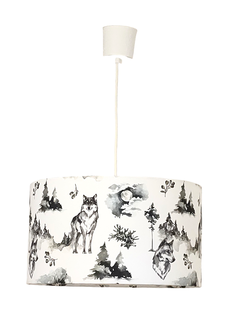 La suspension abat-jour est réalisée à partir d'une carcasse métallique finition époxy blanche recouverte de tissu 100% coton certifié OEKO TEX (sans produit chimique) motifs imprimés Les loups contrecollé sur un polyphane ignifugé blanc (PVC non inflammable).