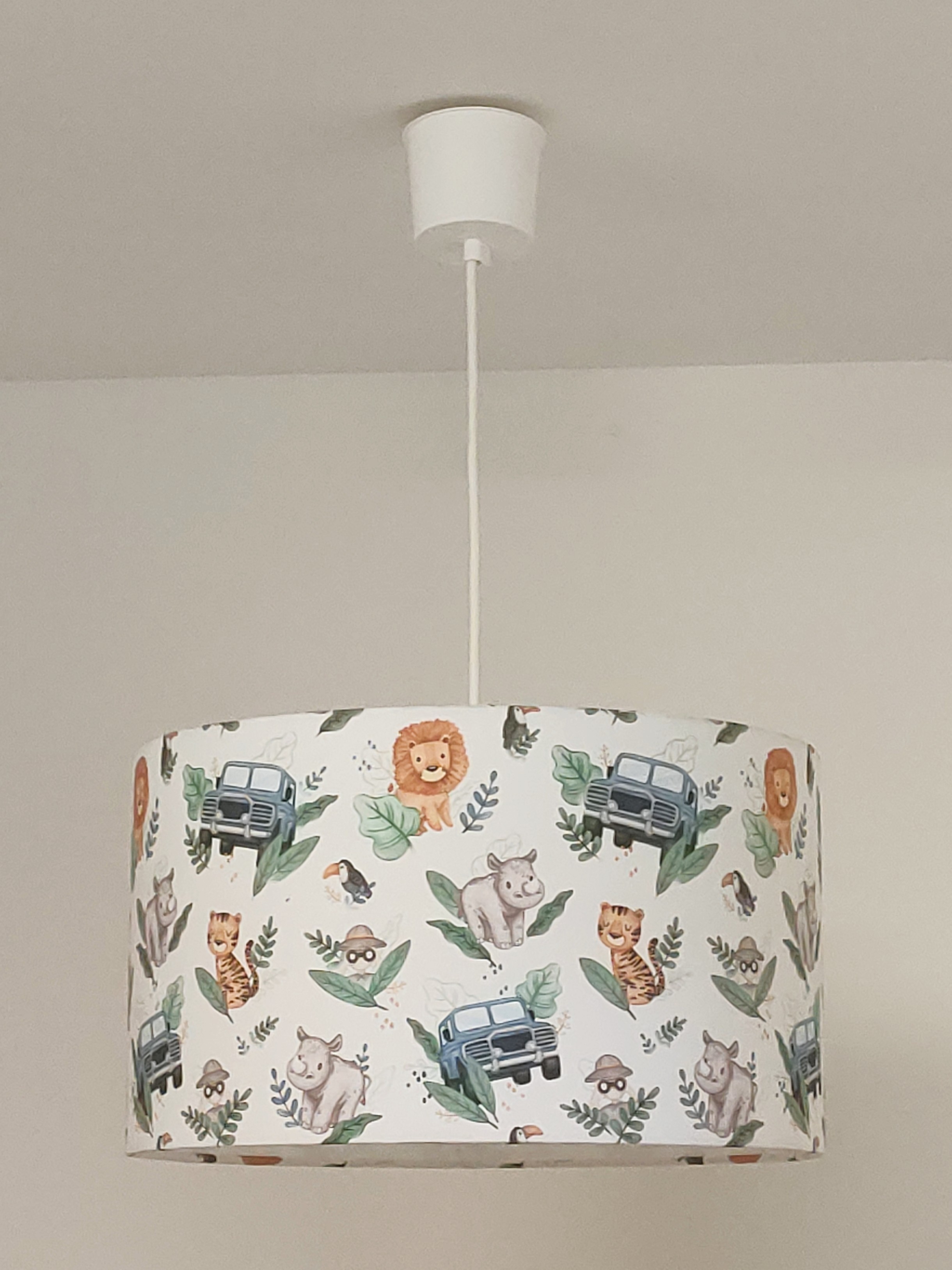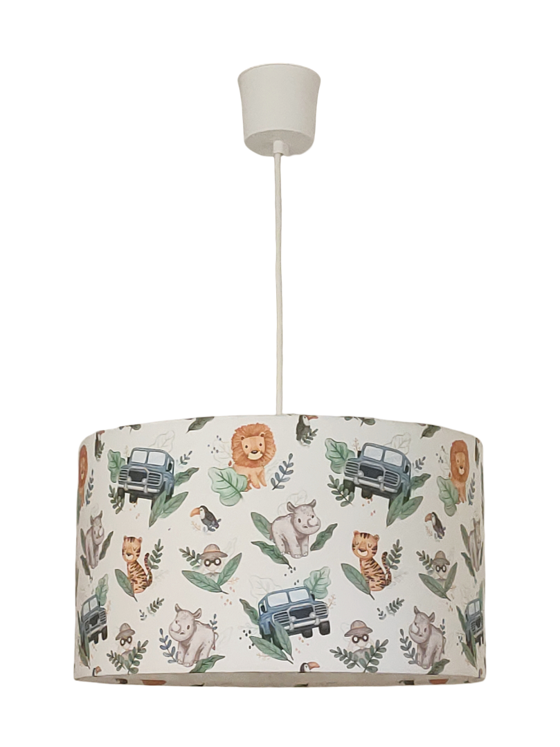 La suspension abat-jour est réalisée à partir d'une carcasse métallique finition époxy blanche recouverte de tissu 100% coton certifié OEKO TEX (sans produit chimique) motifs imprimés safari contrecollé sur un polyphane ignifugé blanc (PVC non inflammable).