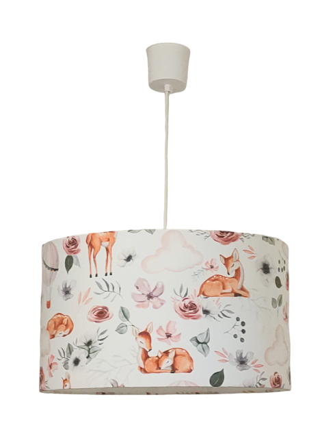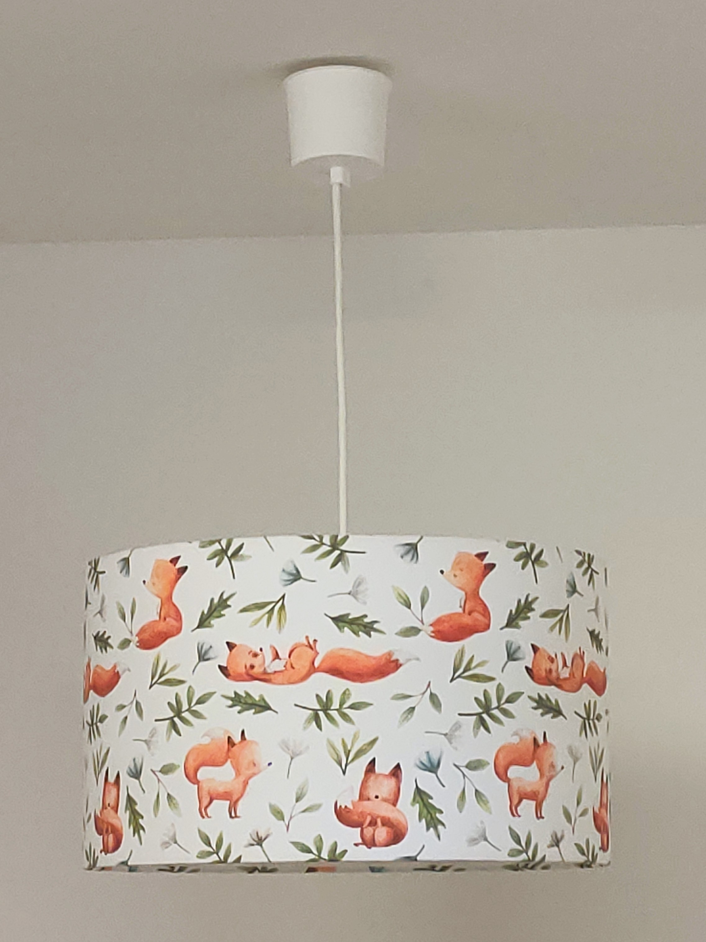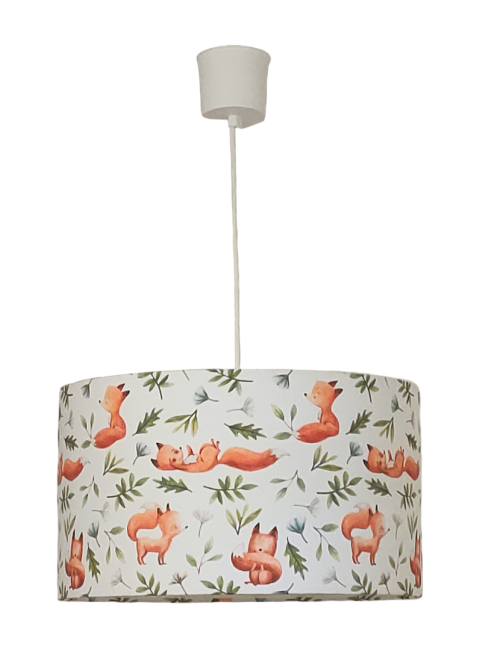 La suspension abat-jour est réalisée à partir d'une carcasse métallique finition époxy blanche recouverte de tissu 100% coton certifié OEKO TEX (sans produit chimique) motifs imprimés renards contrecollé sur un polyphane ignifugé blanc (PVC non inflammable).