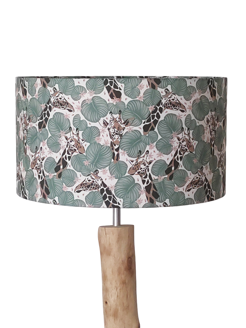 L’abat-jour est réalisé à partir d'une carcasse métallique finition époxy blanche recouverte de tissu 100% coton certifié OEKO TEX (sans produit chimique) motifs imprimés Girafes contrecollé sur un polyphane ignifugé blanc (PVC non inflammable).
