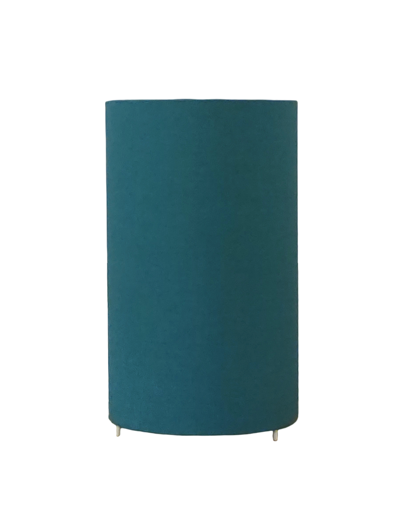 La lampe tube est réalisée à partir d'une carcasse métallique avec pieds finition époxy blanche recouverte de papier intissé imprimé bleu lagon contrecollé sur un polyphane ignifugé blanc (PVC non inflammable).