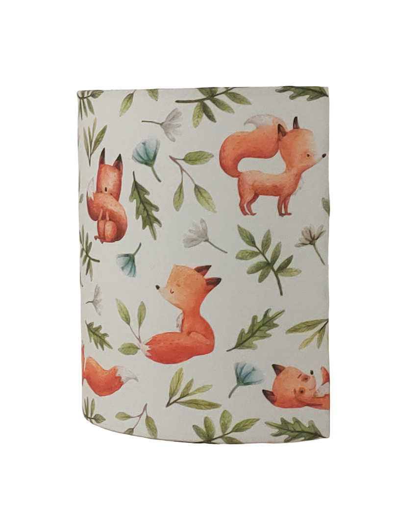 Les Appliques Murales sont réalisées à partir d'une carcasse métallique demi-cylindrique finition peinture époxy blanche recouverte de tissu 100% coton certifié OEKO TEX (sans produit chimique) motifs imprimés Renards contrecollé sur un polyphane ignifugé blanc (PVC non inflammable).