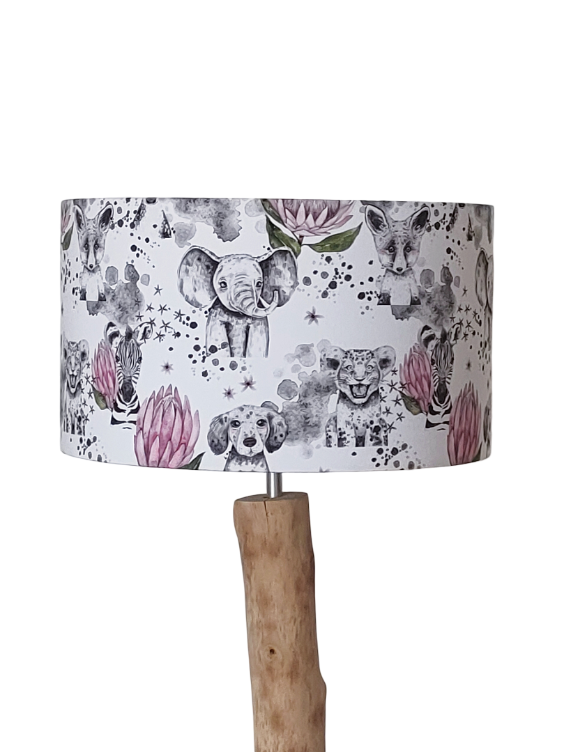 L’abat-jour est réalisé à partir d'une carcasse métallique finition époxy blanche recouverte de tissu 100% coton certifié OEKO TEX (sans produit chimique) motifs imprimés Animaux de la Jungle ( fleurs roses - tigre - renard - zèbre - éléphant - chien) contrecollé sur un polyphane ignifugé blanc (PVC non inflammable).