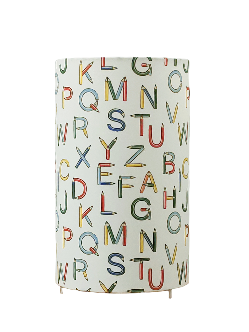 La lampe tube est réalisée à partir d'une carcasse métallique avec pieds finition époxy blanche recouverte de tissu 100% coton certifié OEKO TEX (sans produit chimique) motifs imprimés ABC - abécédaire lettres alphabet crayons contrecollé sur un polyphane ignifugé blanc (PVC non inflammable).
