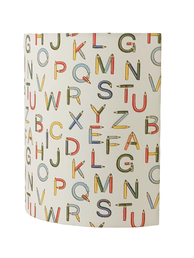 Les Appliques Murales sont réalisées à partir d'une carcasse métallique demi-cylindrique finition peinture époxy blanche recouverte de tissu 100% coton certifié OEKO TEX (sans produit chimique) motifs imprimés ABC - abécédaire lettres alphabet crayons contrecollé sur un polyphane ignifugé blanc (PVC non inflammable).