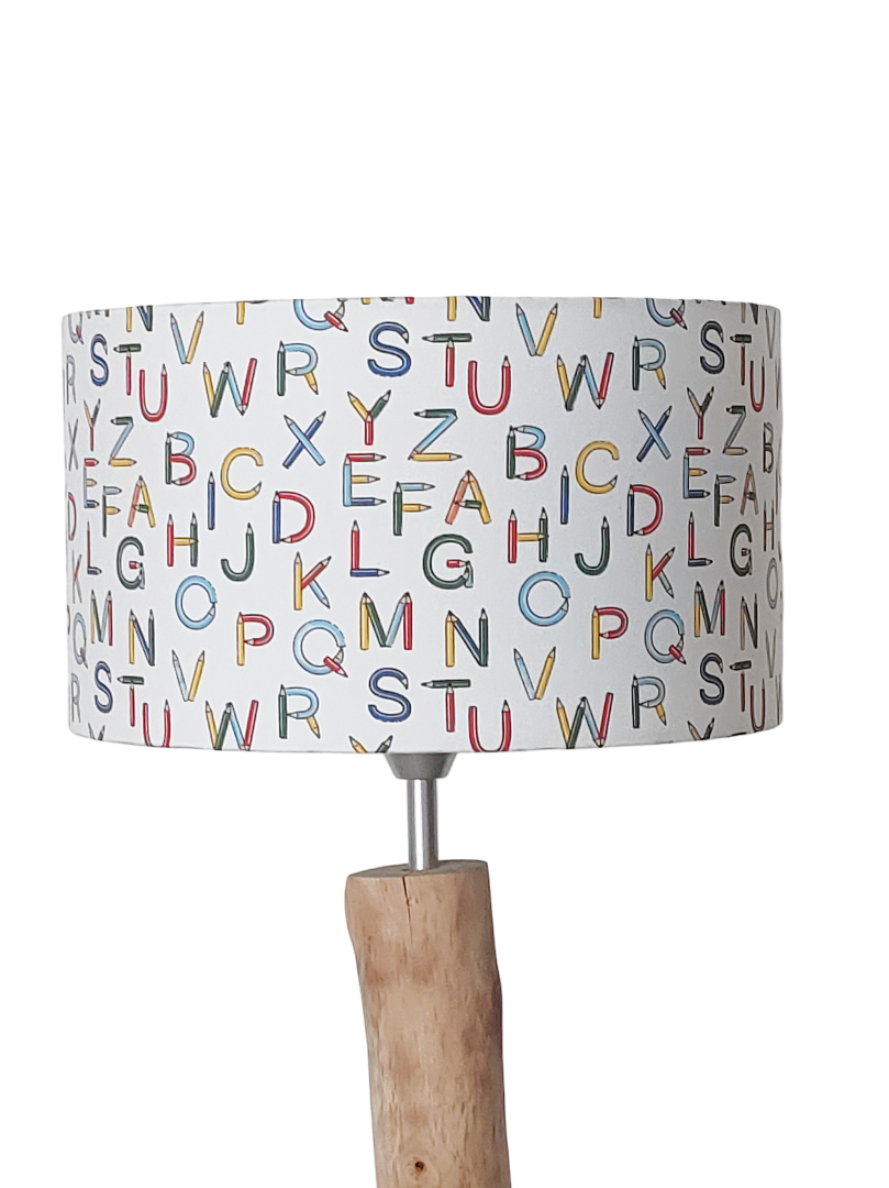 L’abat-jour est réalisé à partir d'une carcasse métallique finition époxy blanche recouverte de tissu 100% coton certifié OEKO TEX (sans produit chimique) motifs imprimés ABC - abécédaire lettres alphabet crayons contrecollé sur un polyphane ignifugé blanc (PVC non inflammable).