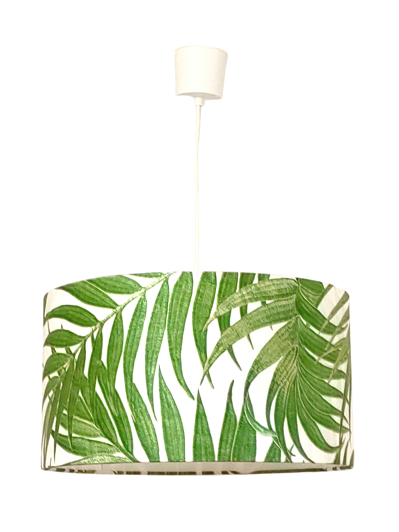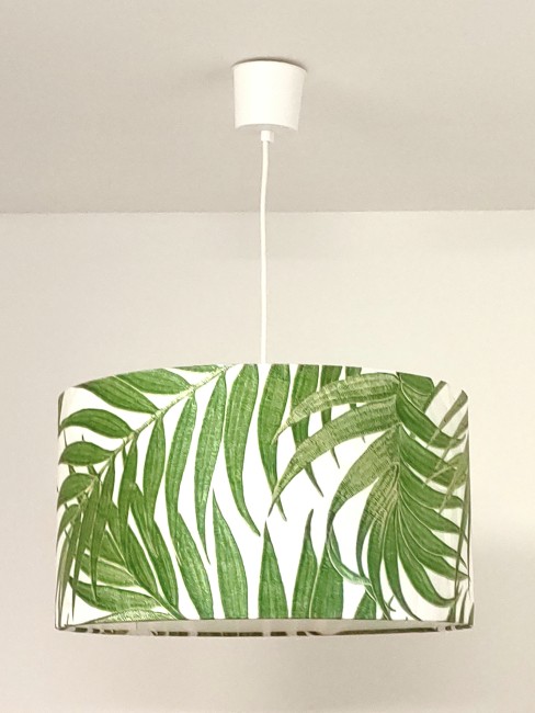 La suspension abat-jour est réalisée à partir d'une carcasse métallique finition époxy blanche recouverte de papier intissé imprimé motifs imprimés feuilles vertes exotiques contrecollé sur un polyphane ignifugé blanc (PVC non inflammable).