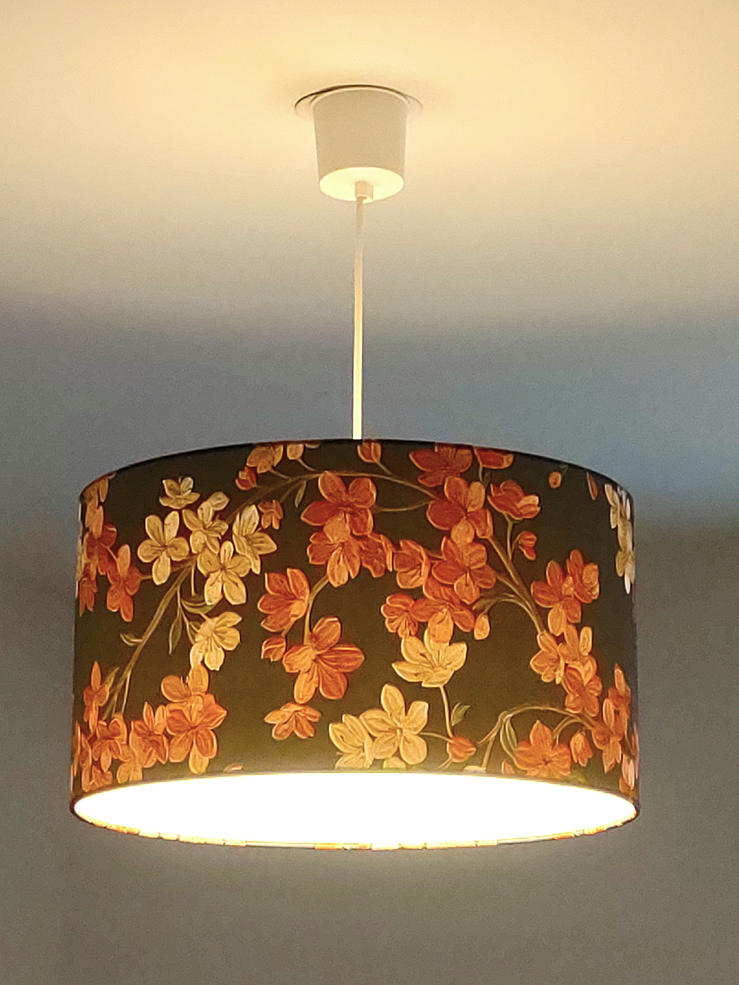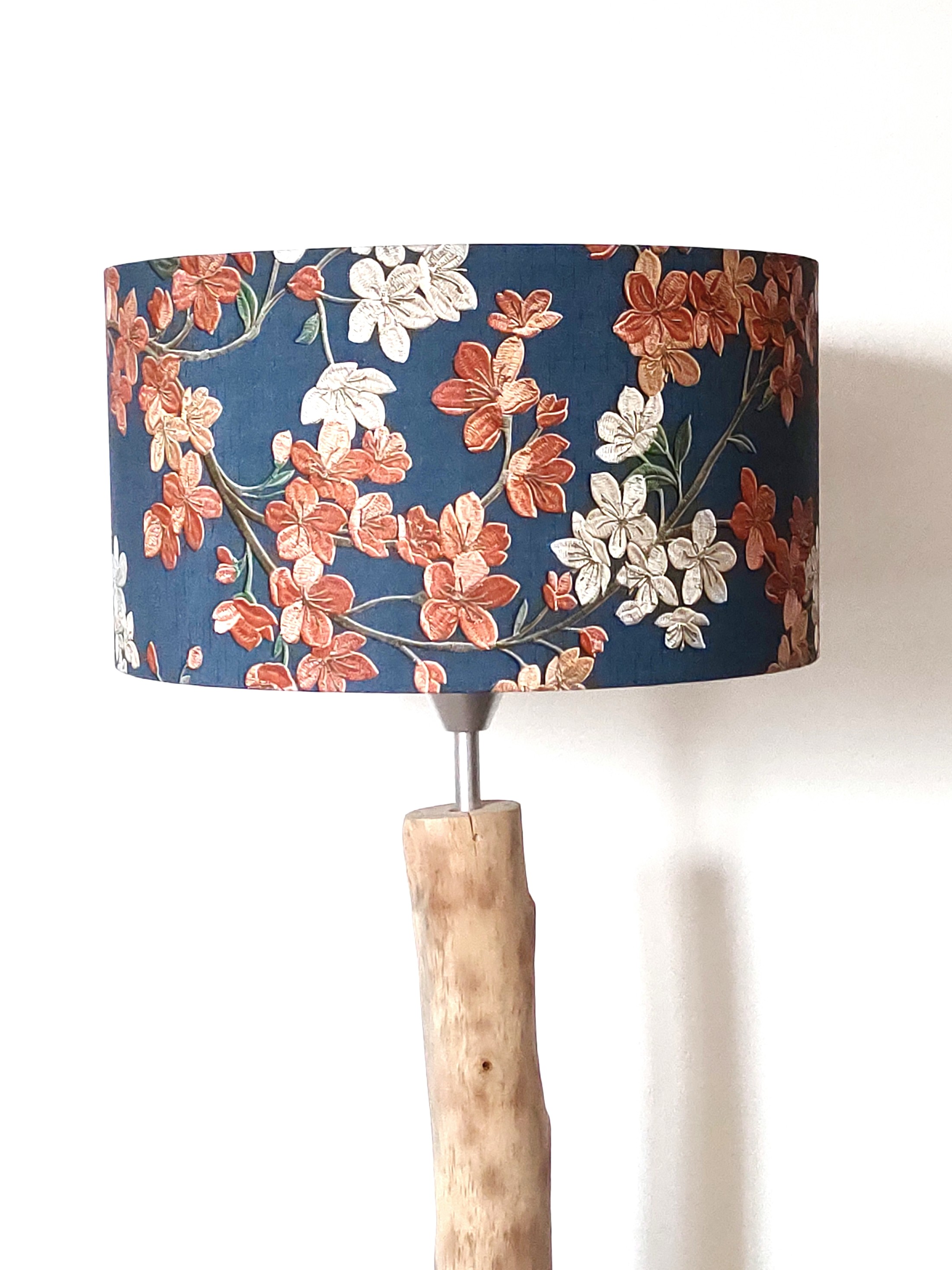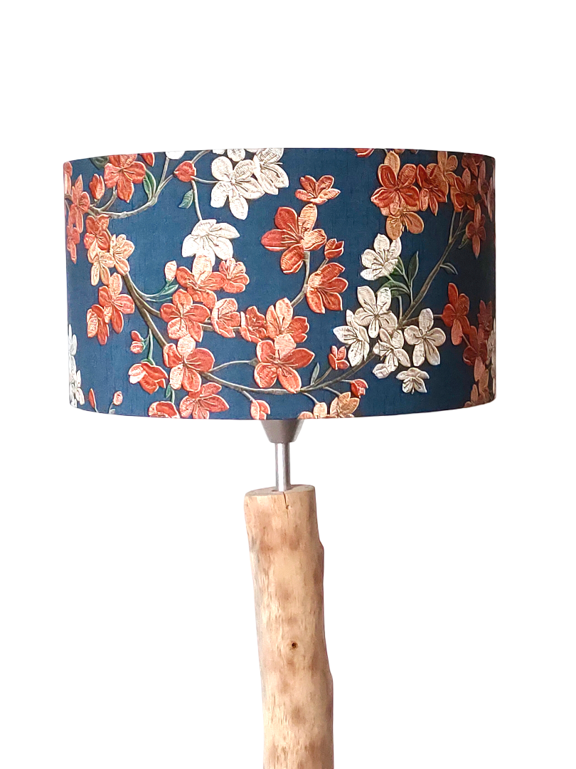 L’abat-jour est réalisé à partir d'une carcasse métallique finition époxy blanche recouverte de papier intissé imprimé motifs fleurs blanches et terracotta sur fond bleu marine contrecollé sur un polyphane ignifugé blanc (PVC non inflammable).