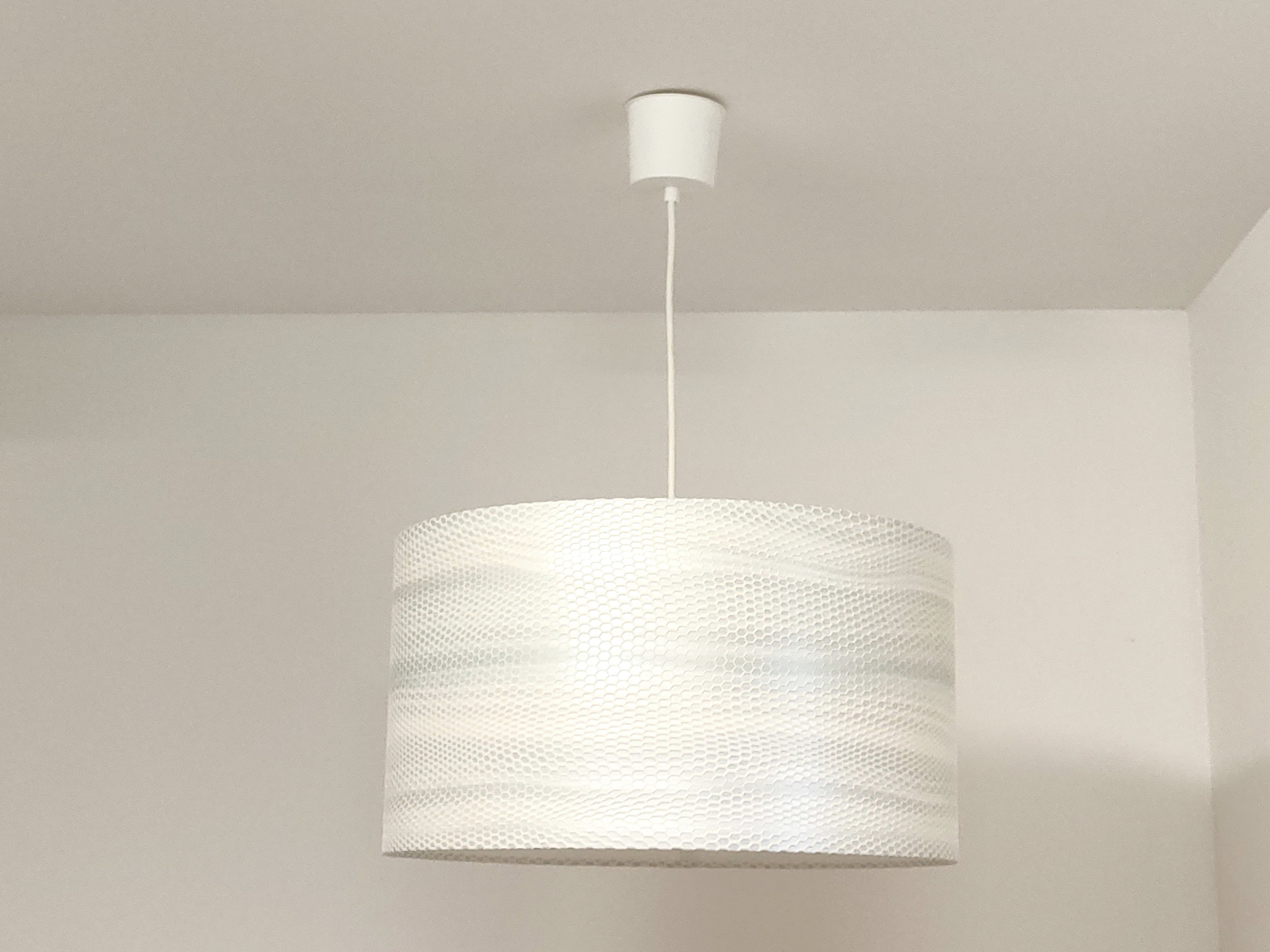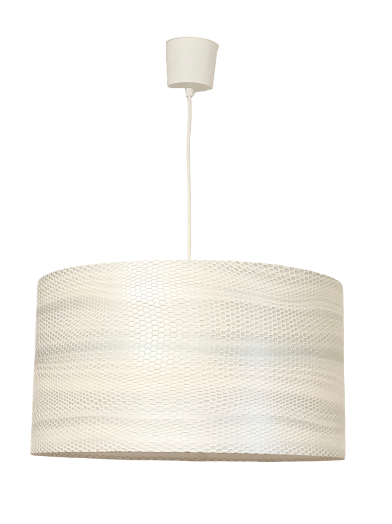 La suspension abat-jour est réalisée à partir d'une carcasse métallique finition époxy blanche recouverte de papier intissé imprimé motifs géométriques blanc métallisé irisé contrecollé sur un polyphane ignifugé blanc (PVC non inflammable).