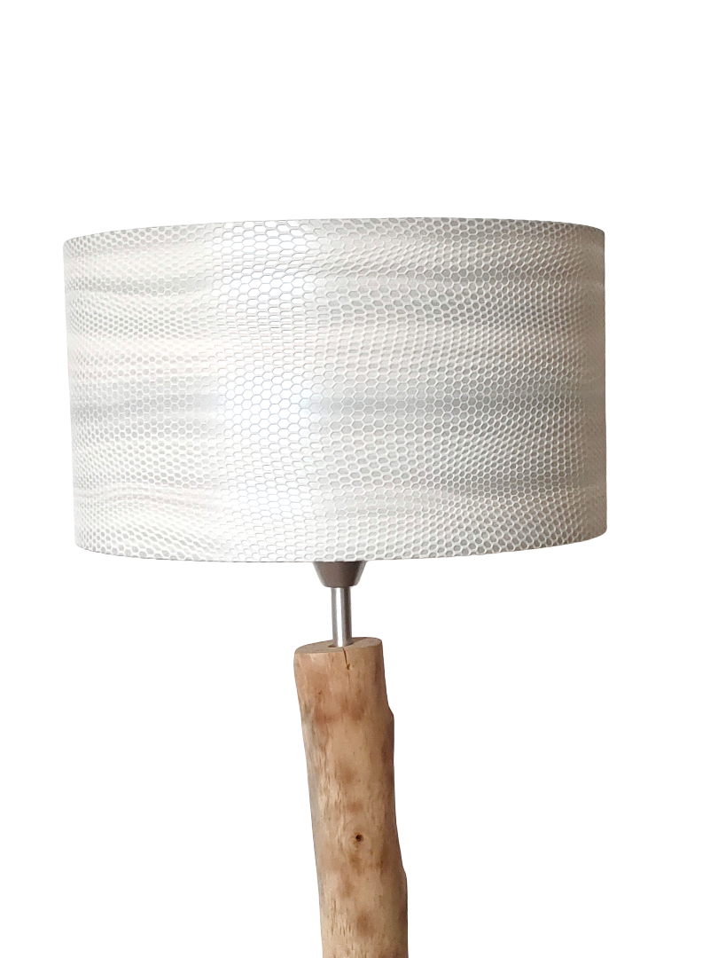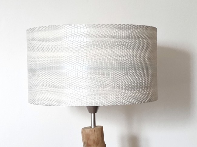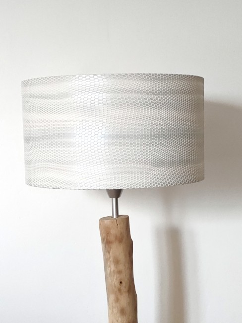 L’abat-jour est réalisé à partir d'une carcasse métallique finition époxy blanche recouverte de papier intissé imprimé motifs géométriques blanc métallisé irisé contrecollé sur un polyphane ignifugé blanc (PVC non inflammable).