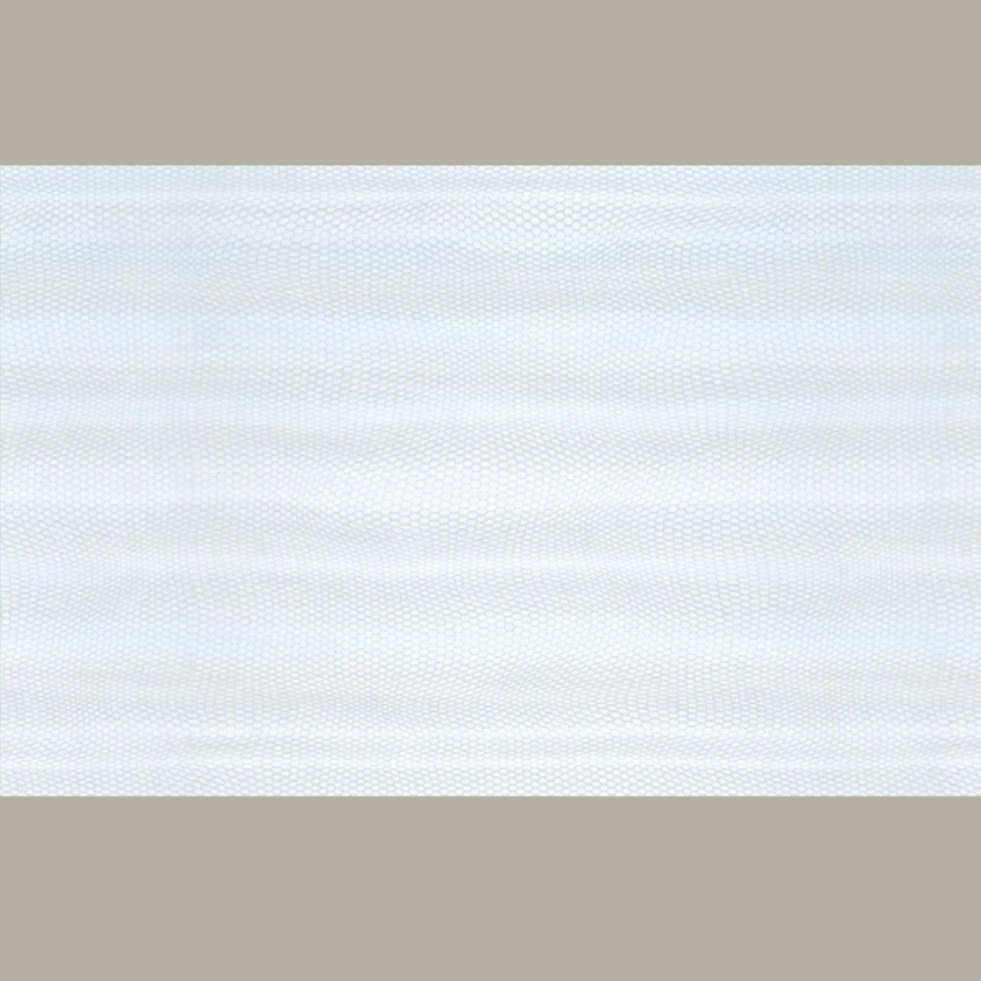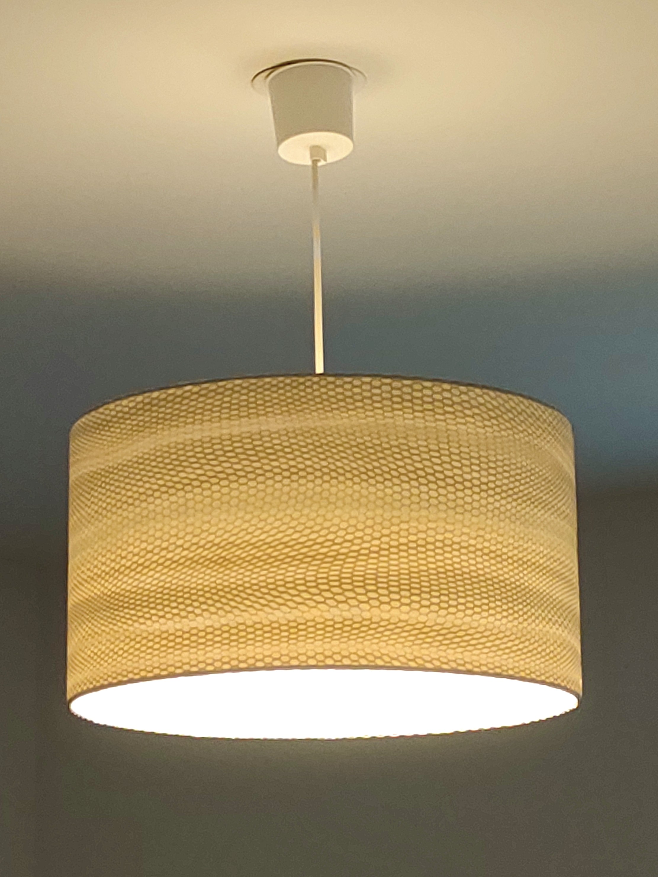 L’abat-jour est réalisé à partir d'une carcasse métallique finition époxy blanche recouverte de papier intissé imprimé motifs géométriques blanc métallisé irisé contrecollé sur un polyphane ignifugé blanc (PVC non inflammable).
