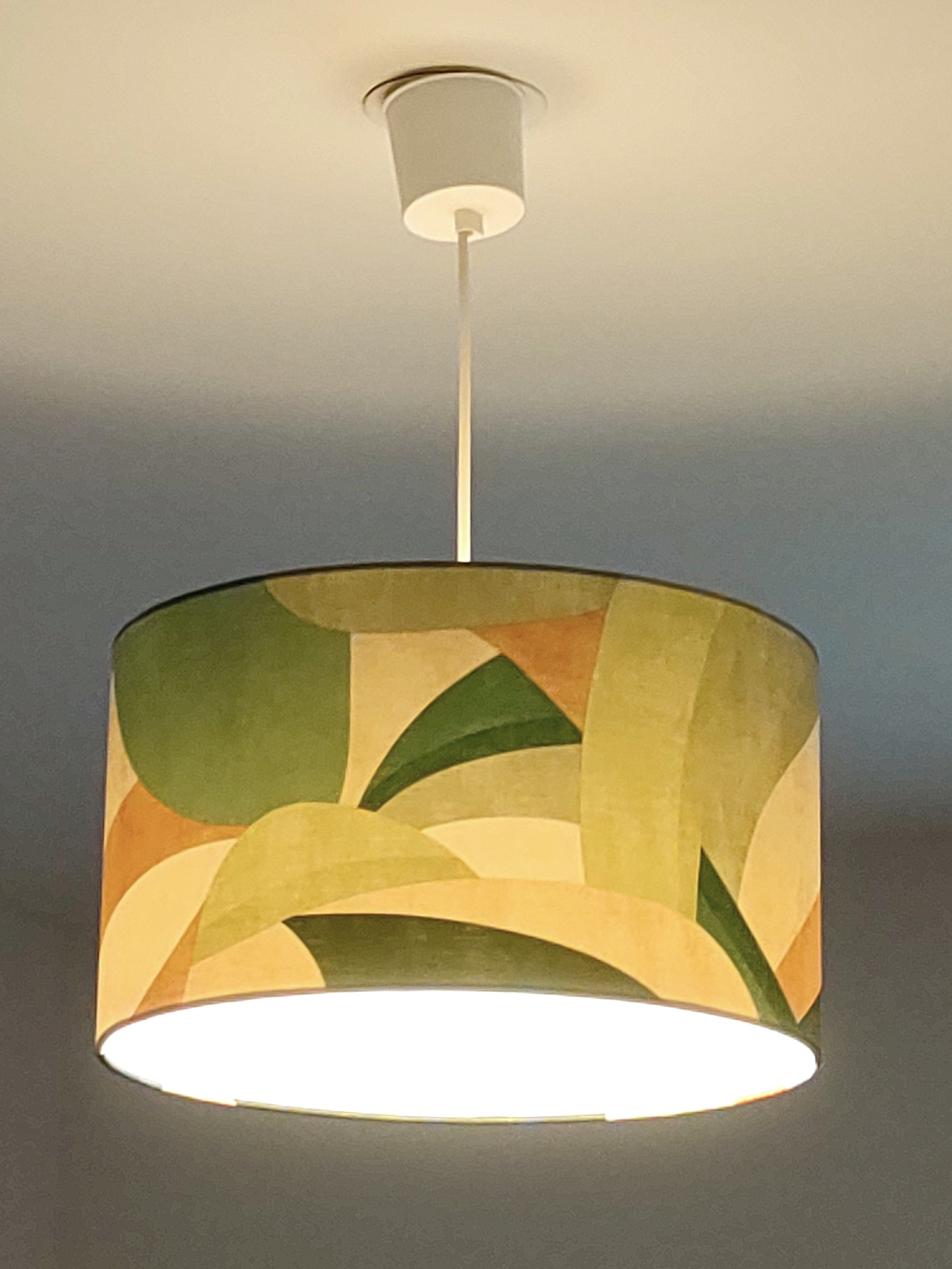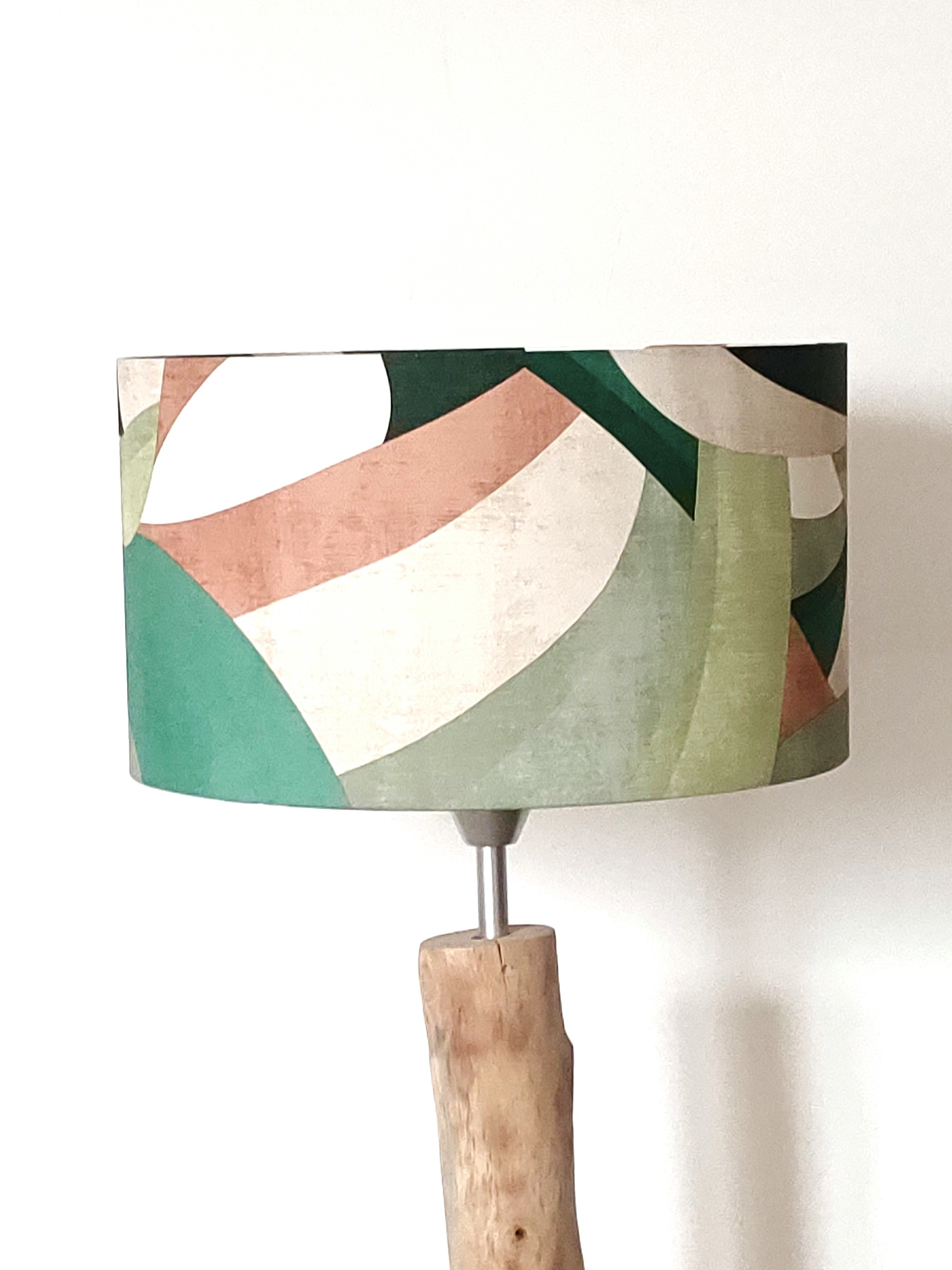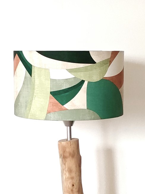 L’abat-jour est réalisé à partir d'une carcasse métallique finition époxy blanche recouverte de papier intissé imprimé géométriques formes abstraites tons verts contrecollé sur un polyphane ignifugé blanc (PVC non inflammable).