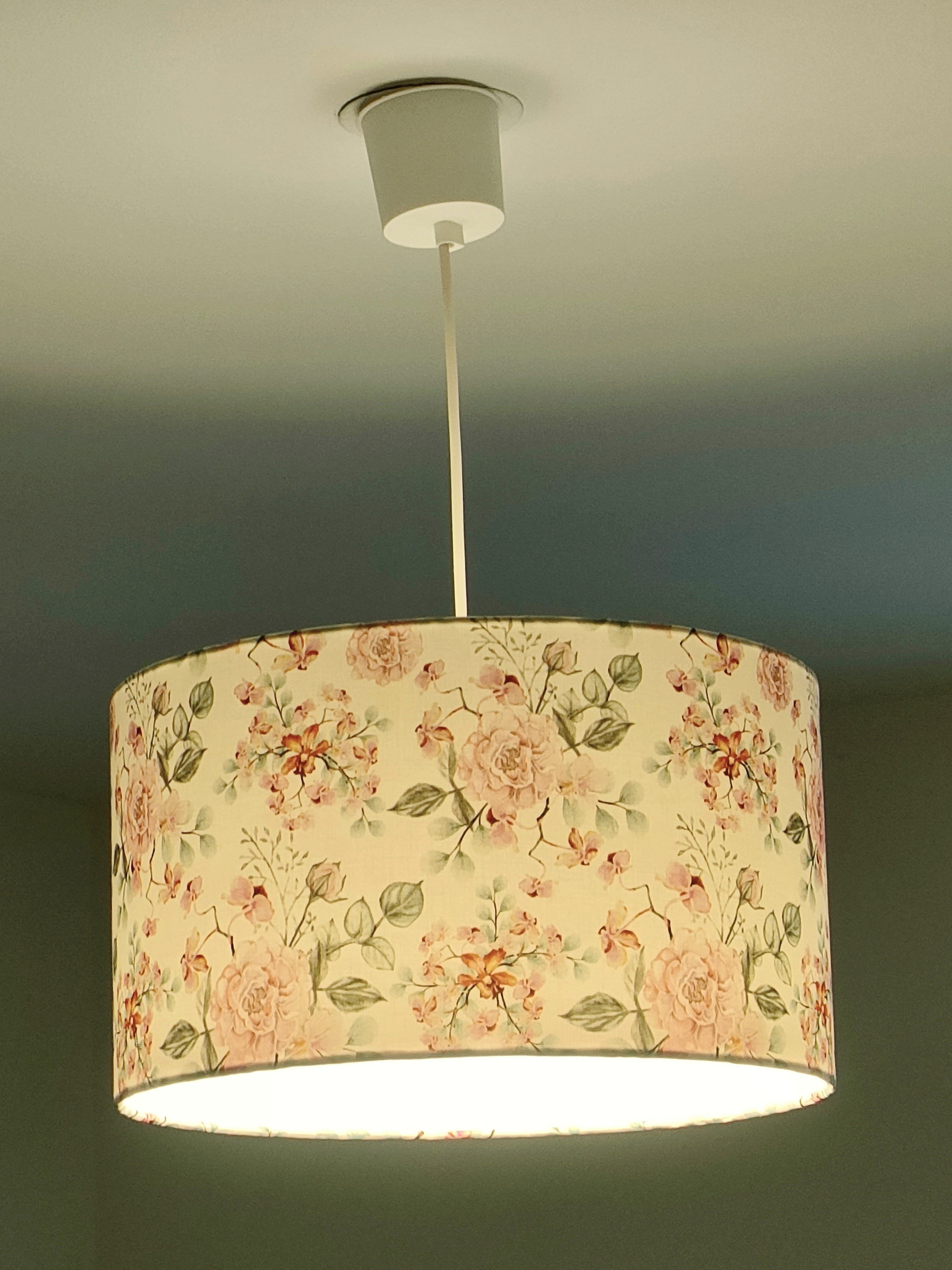 La suspension abat-jour est réalisée à partir d'une carcasse métallique finition époxy blanche recouverte de tissu 100% coton certifié OEKO TEX (sans produit chimique) motifs imprimés roses sauvages contrecollé sur un polyphane ignifugé blanc (PVC non inflammable).