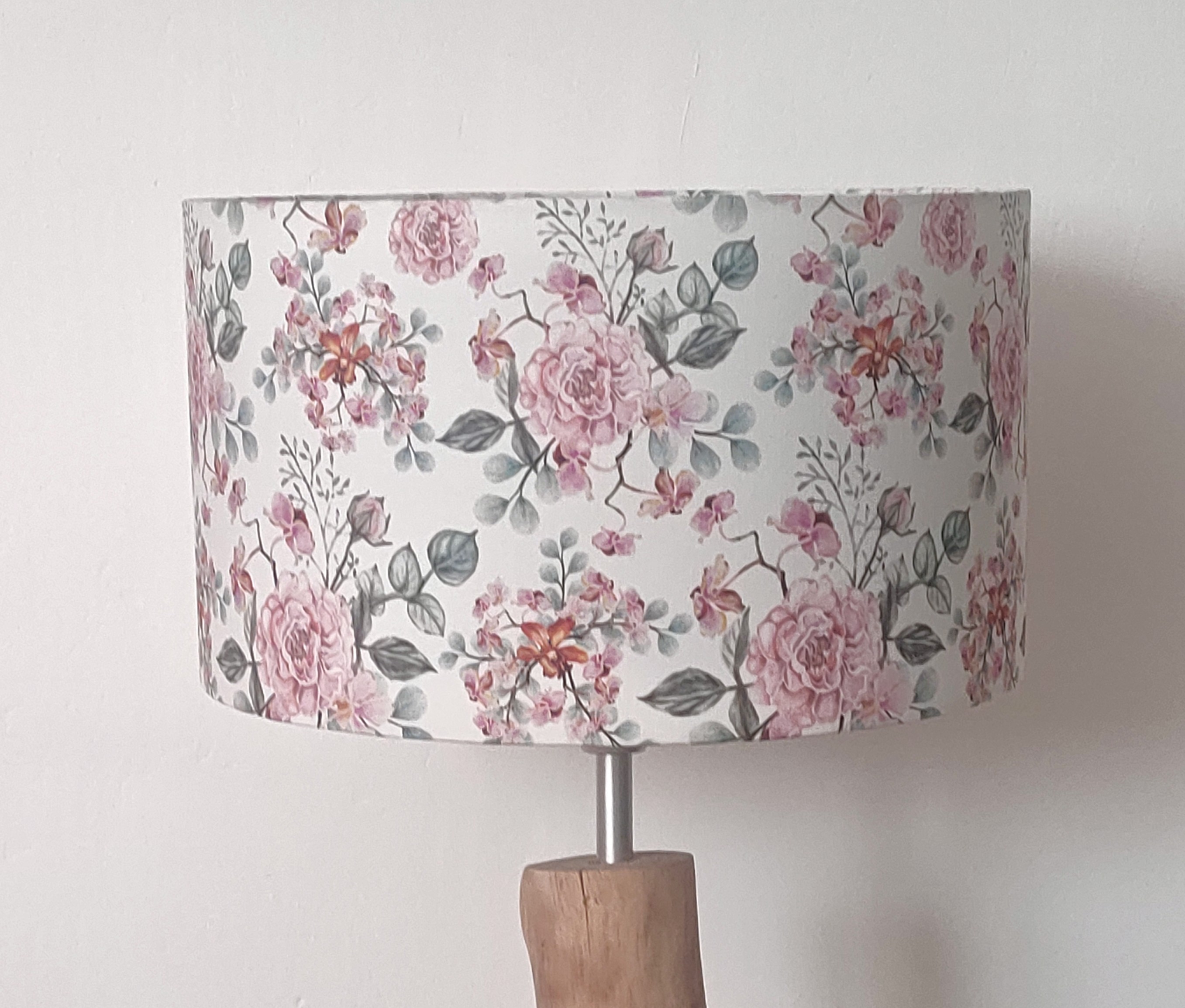 L’abat-jour est réalisé à partir d'une carcasse métallique finition époxy blanche recouverte de tissu 100% coton certifié OEKO TEX (sans produit chimique) motifs imprimés roses sauvages contrecollé sur un polyphane ignifugé blanc (PVC non inflammable).