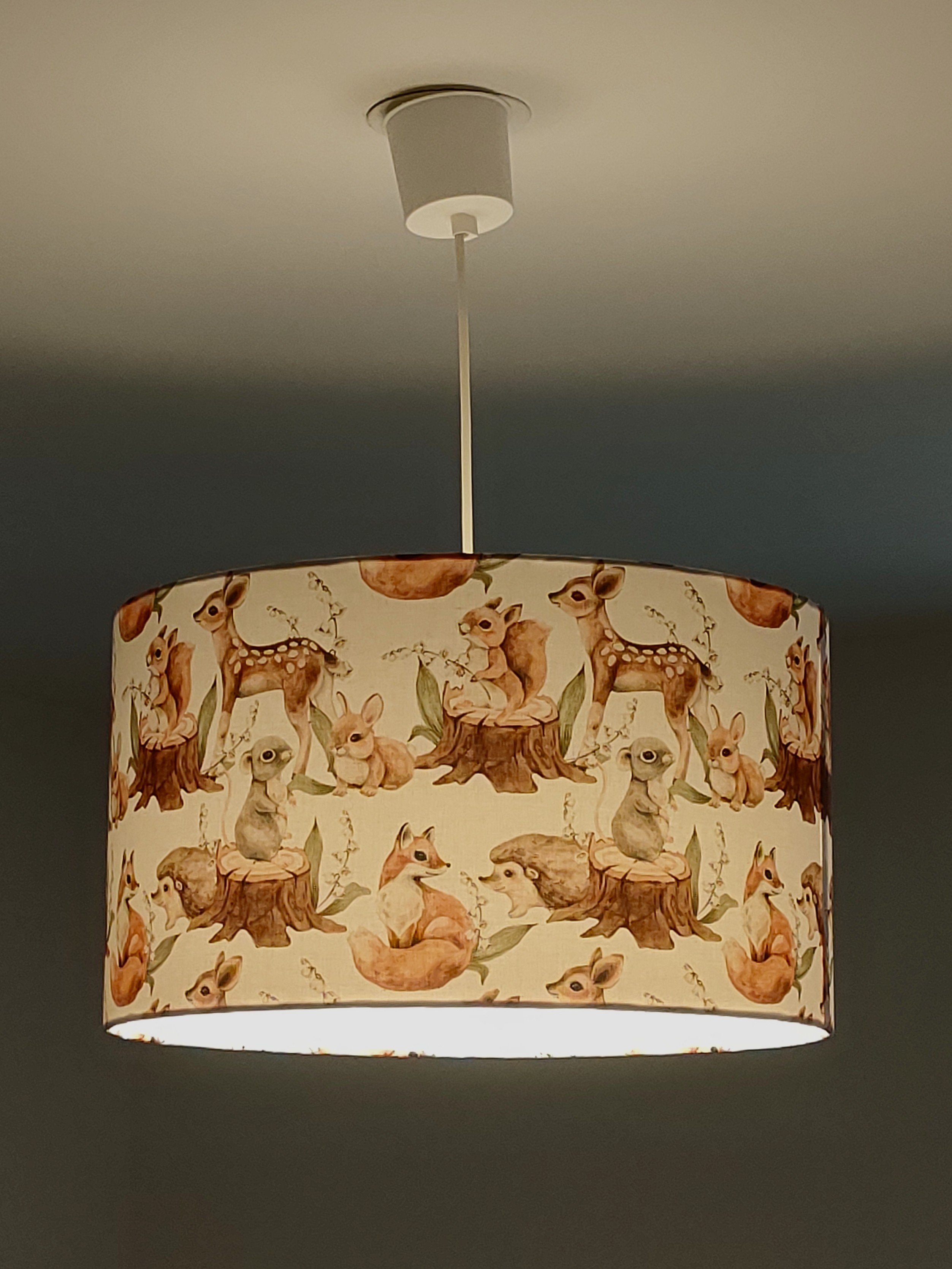 La suspension abat-jour est réalisée à partir d'une carcasse métallique finition époxy blanche recouverte de tissu 100% coton certifié OEKO TEX (sans produit chimique) motifs imprimés animaux de la forêt - biche renard écureuil hérisson contrecollé sur un polyphane ignifugé blanc (PVC non inflammable).