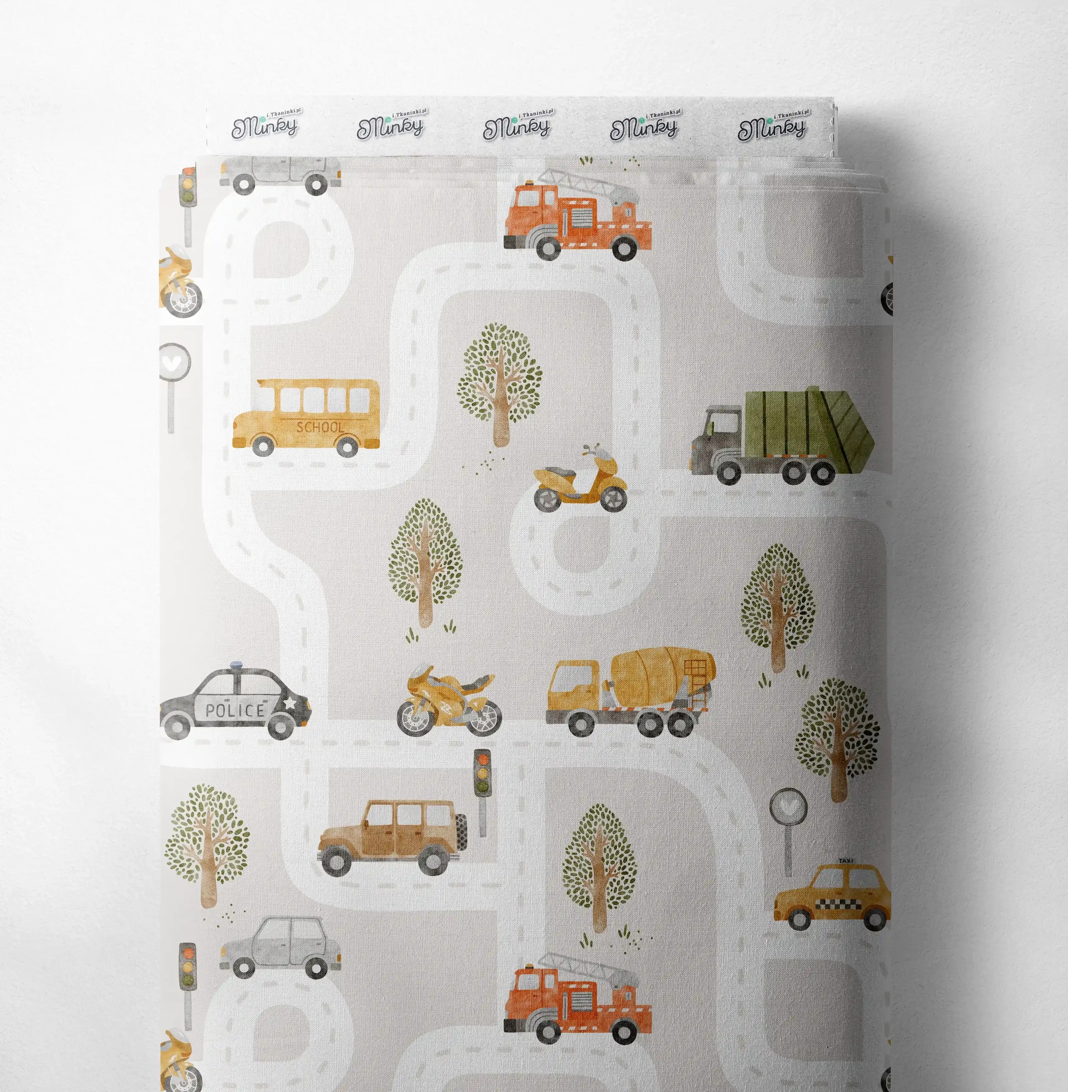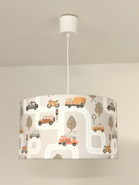 La suspension abat-jour est réalisée à partir d'une carcasse métallique finition époxy blanche recouverte de tissu 100% coton certifié OEKO TEX (sans produit chimique) motifs imprimés les voitures en ville contrecollé sur un polyphane ignifugé blanc (PVC non inflammable).