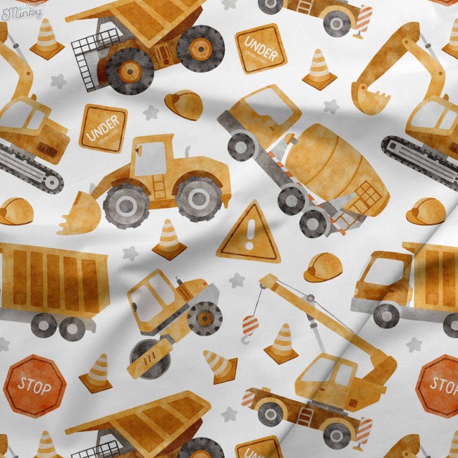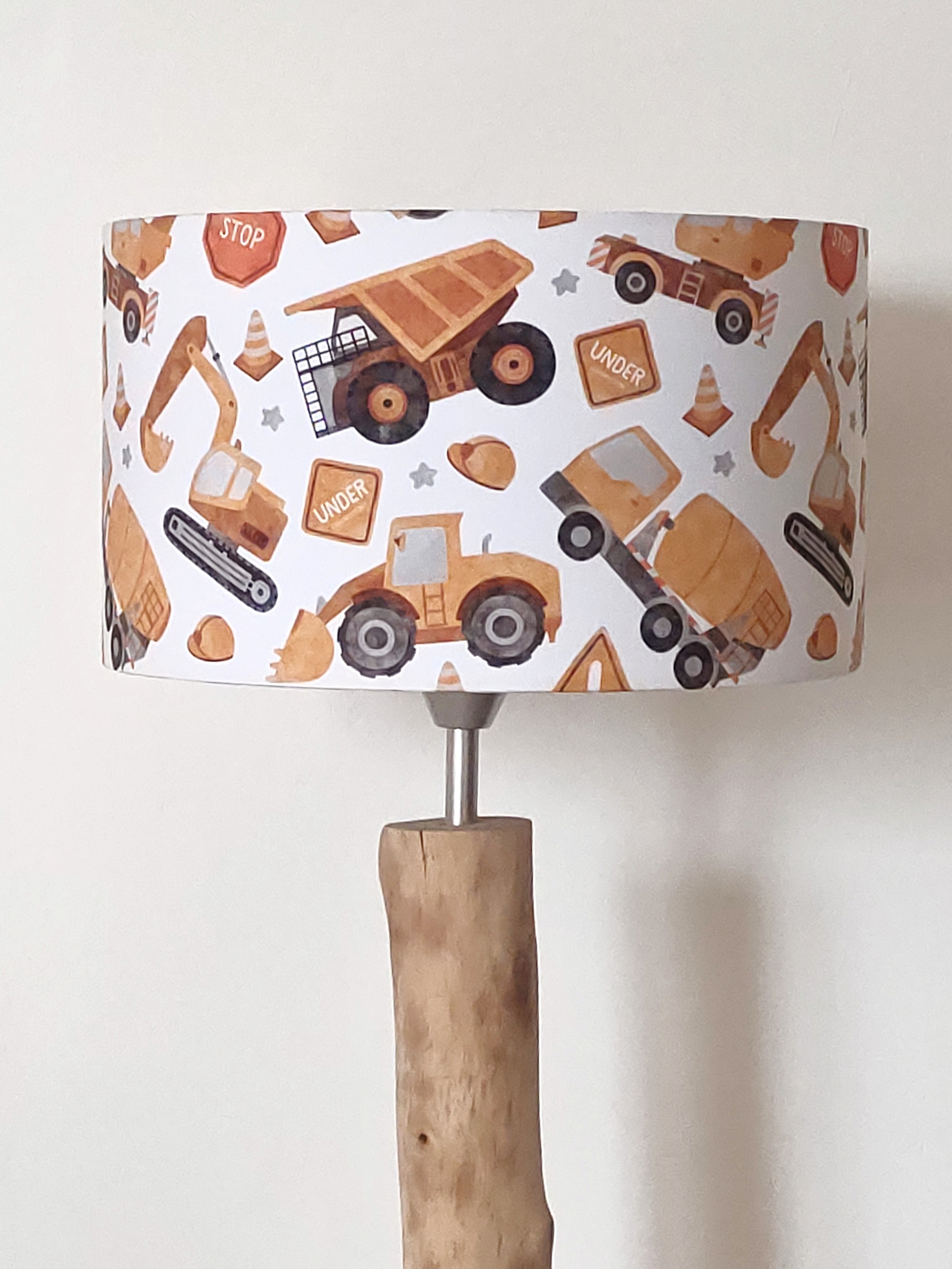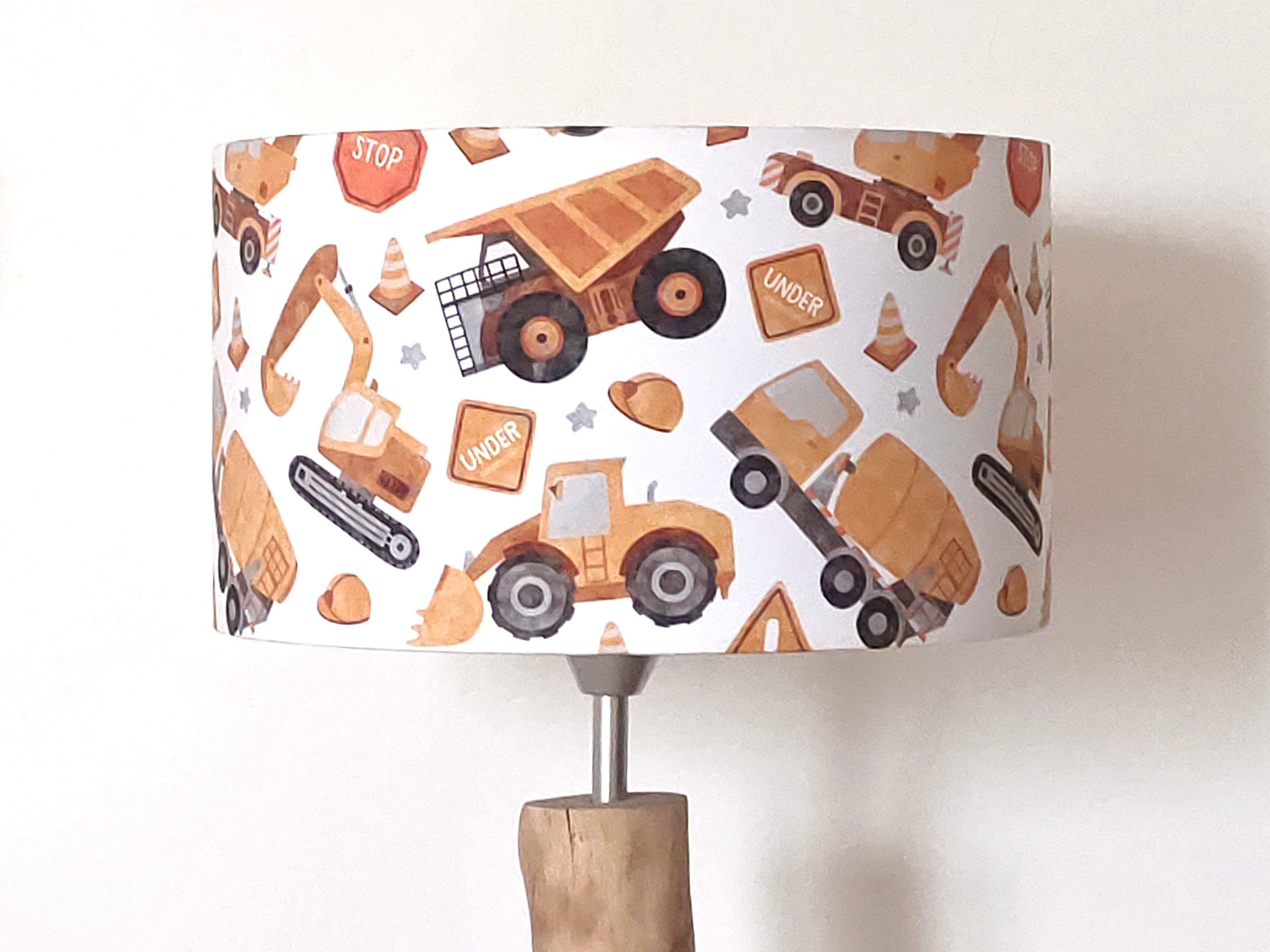 L’abat-jour est réalisé à partir d'une carcasse métallique finition époxy blanche recouverte de tissu 100% coton certifié OEKO TEX (sans produit chimique) motifs imprimés motifs les camions de chantier contrecollé sur un polyphane ignifugé blanc (PVC non inflammable).