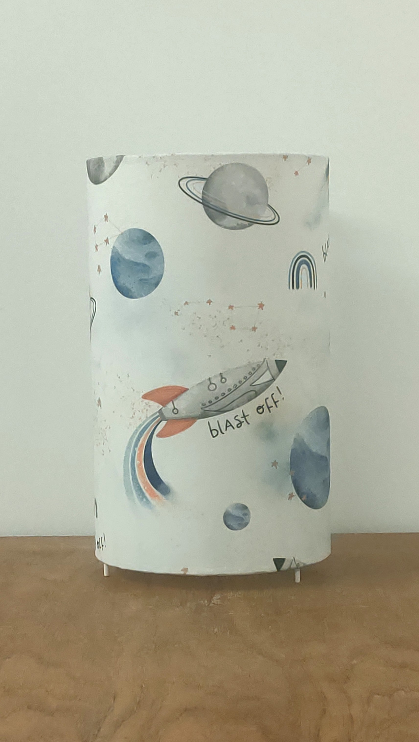 La lampe tube est réalisée à partir d'une carcasse métallique avec pieds finition époxy blanche recouverte de tissu 100% coton certifié OEKO TEX (sans produit chimique) motifs imprimés L'espace (fusées, planètes, étoiles, arc-en ciel) contrecollé sur un polyphane ignifugé blanc (PVC non inflammable).