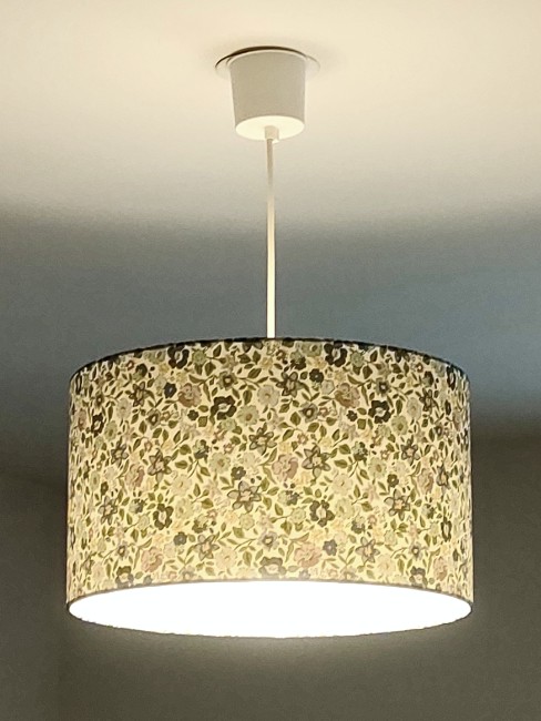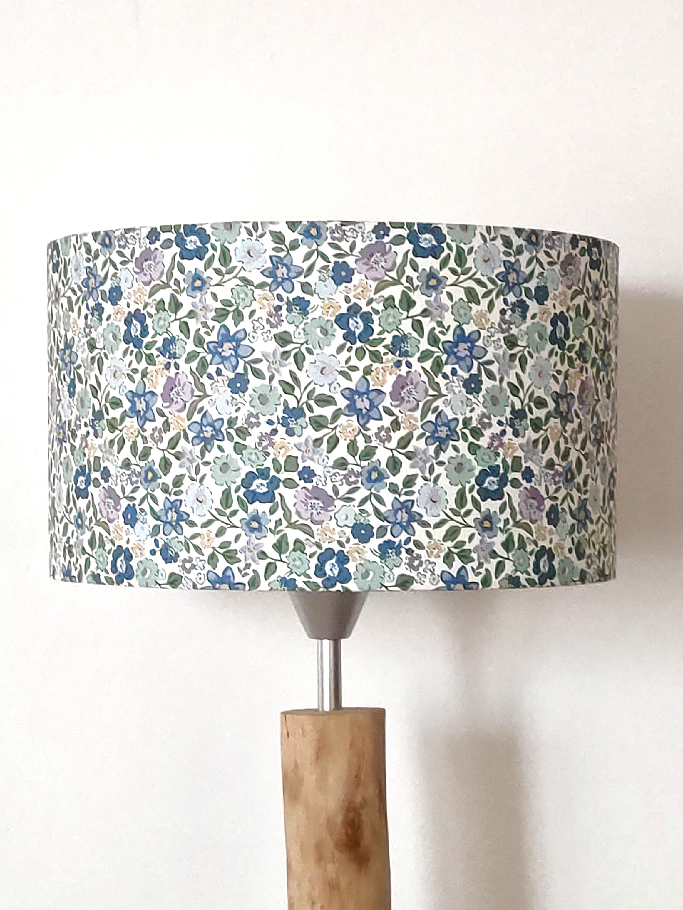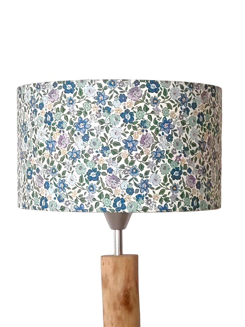 L’abat-jour est réalisé à partir d'une carcasse métallique finition époxy blanche recouverte de papier intissé imprimé motifs Liberty - petites fleurs bleues contrecollé sur un polyphane ignifugé blanc (PVC non inflammable).