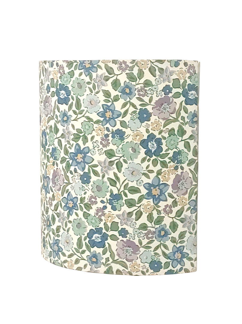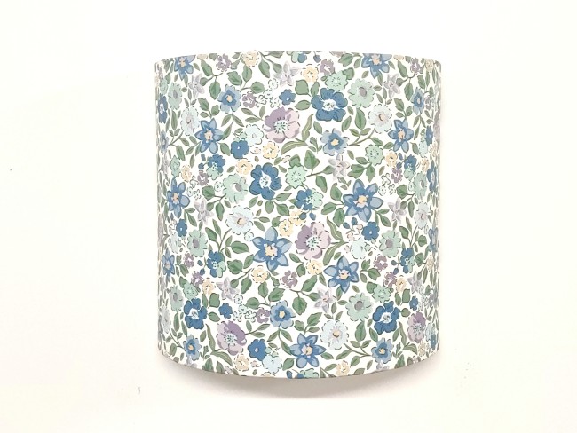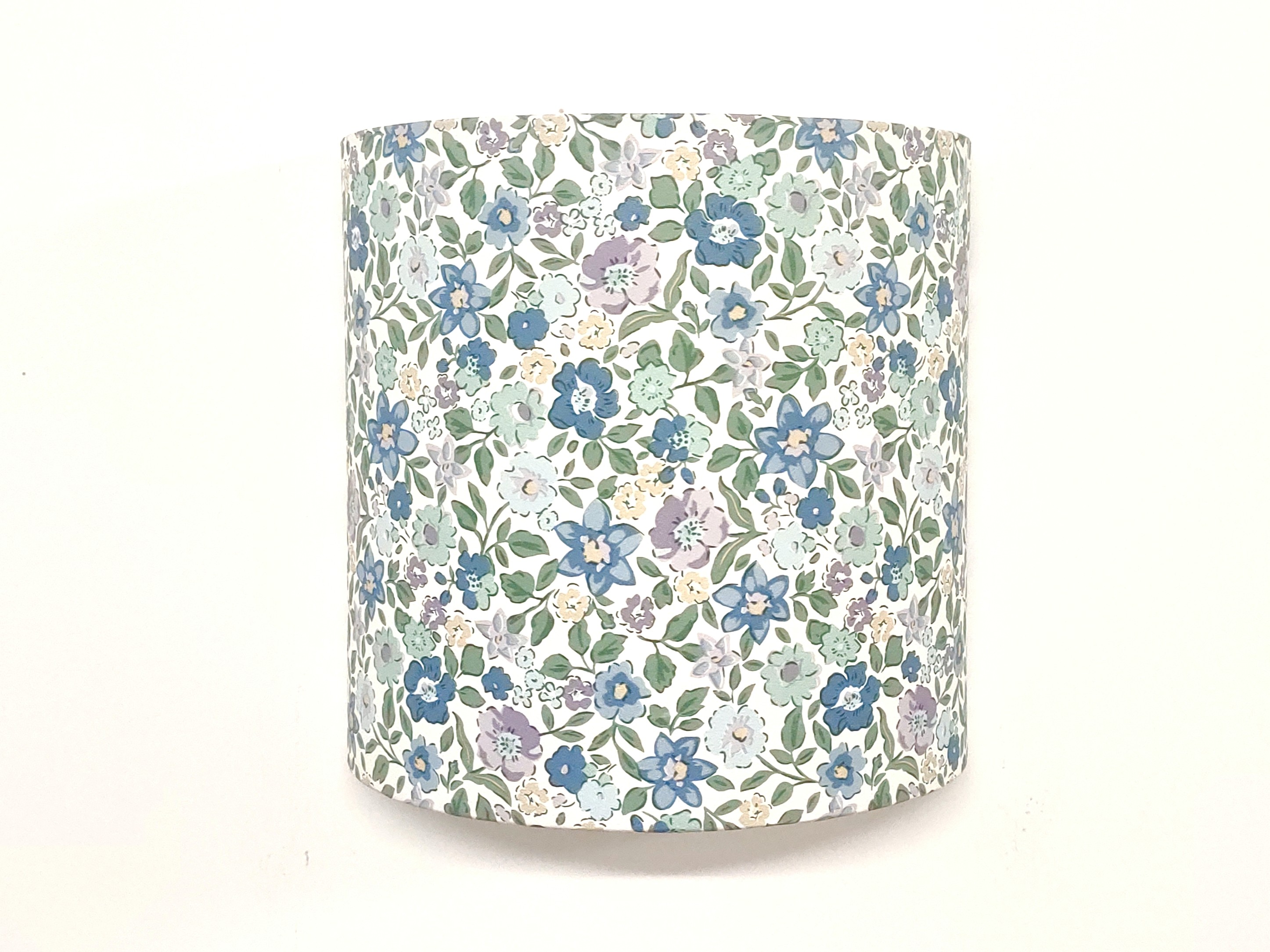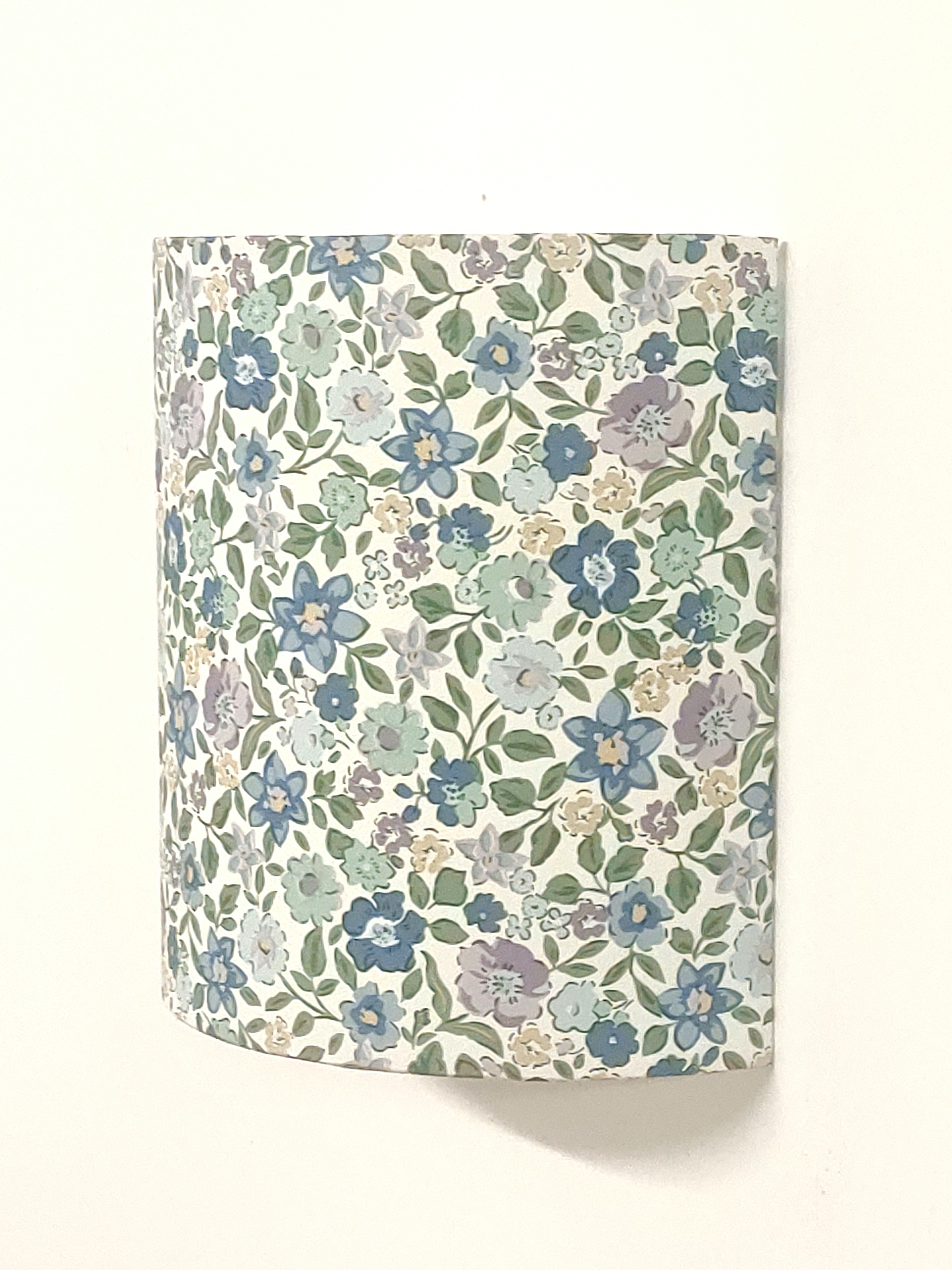 Les Appliques Murales sont réalisées à partir d'une carcasse métallique demi-cylindrique finition peinture époxy blanche recouverte de papier intissé imprimé motifs Liberty - petites fleurs bleues contrecollé sur un polyphane ignifugé blanc (PVC non inflammable).