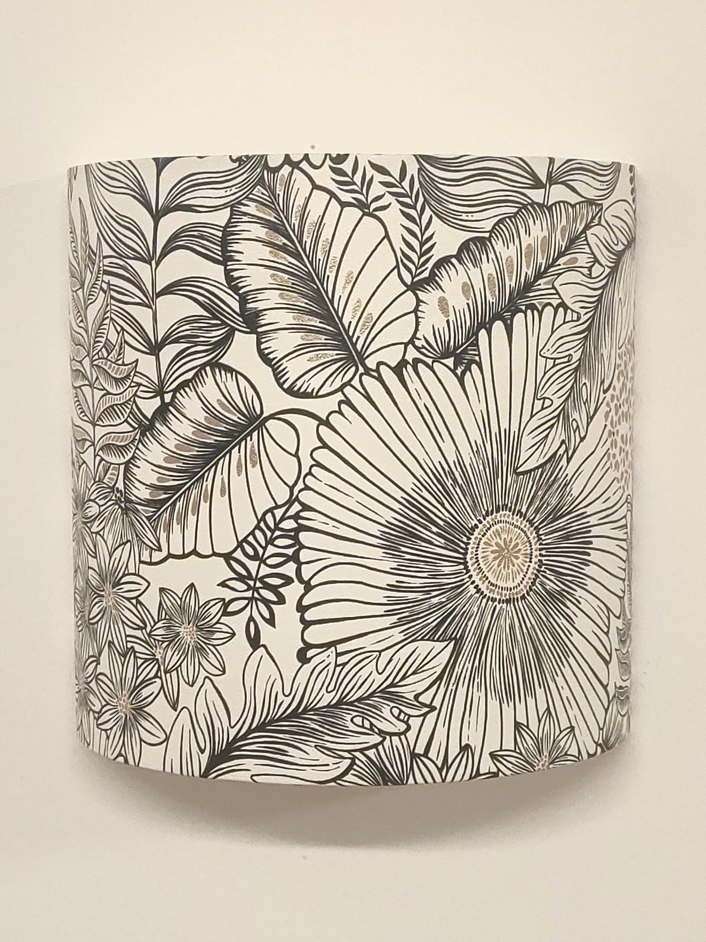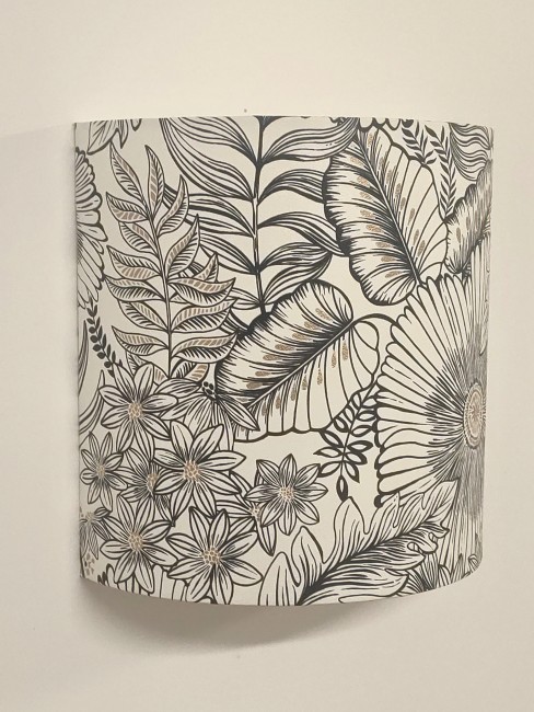 Les Appliques Murales sont réalisées à partir d'une carcasse métallique demi-cylindrique finition peinture époxy blanche recouverte de papier intissé imprimé motifs Fleurs noir et blanc dorées contrecollé sur un polyphane ignifugé blanc (PVC non inflammable).