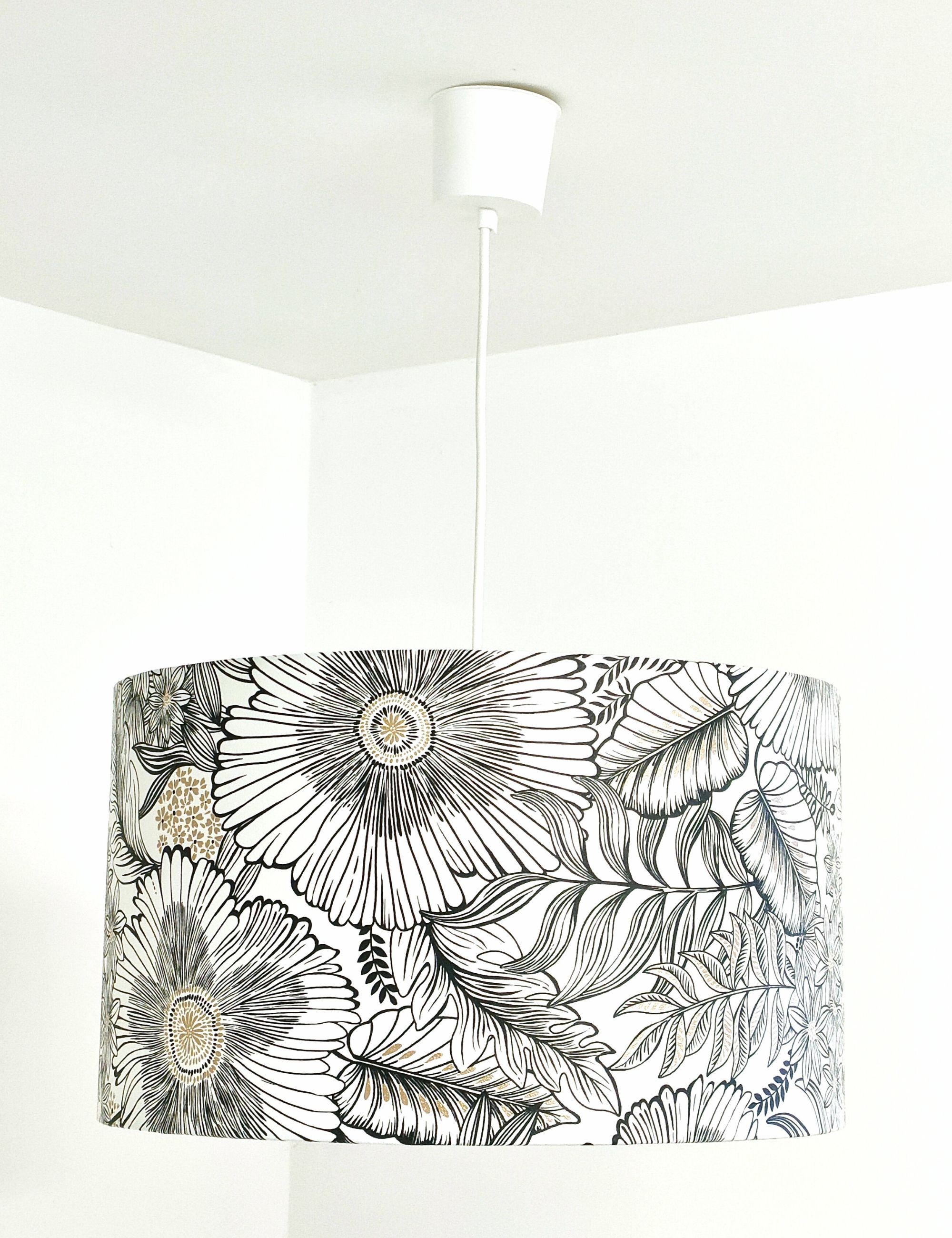 La suspension abat-jour est réalisée à partir d'une carcasse métallique finition époxy blanche recouverte de papier intissé imprimé motifs Fleurs noires et blanches or contrecollé sur un polyphane ignifugé blanc (PVC non inflammable).