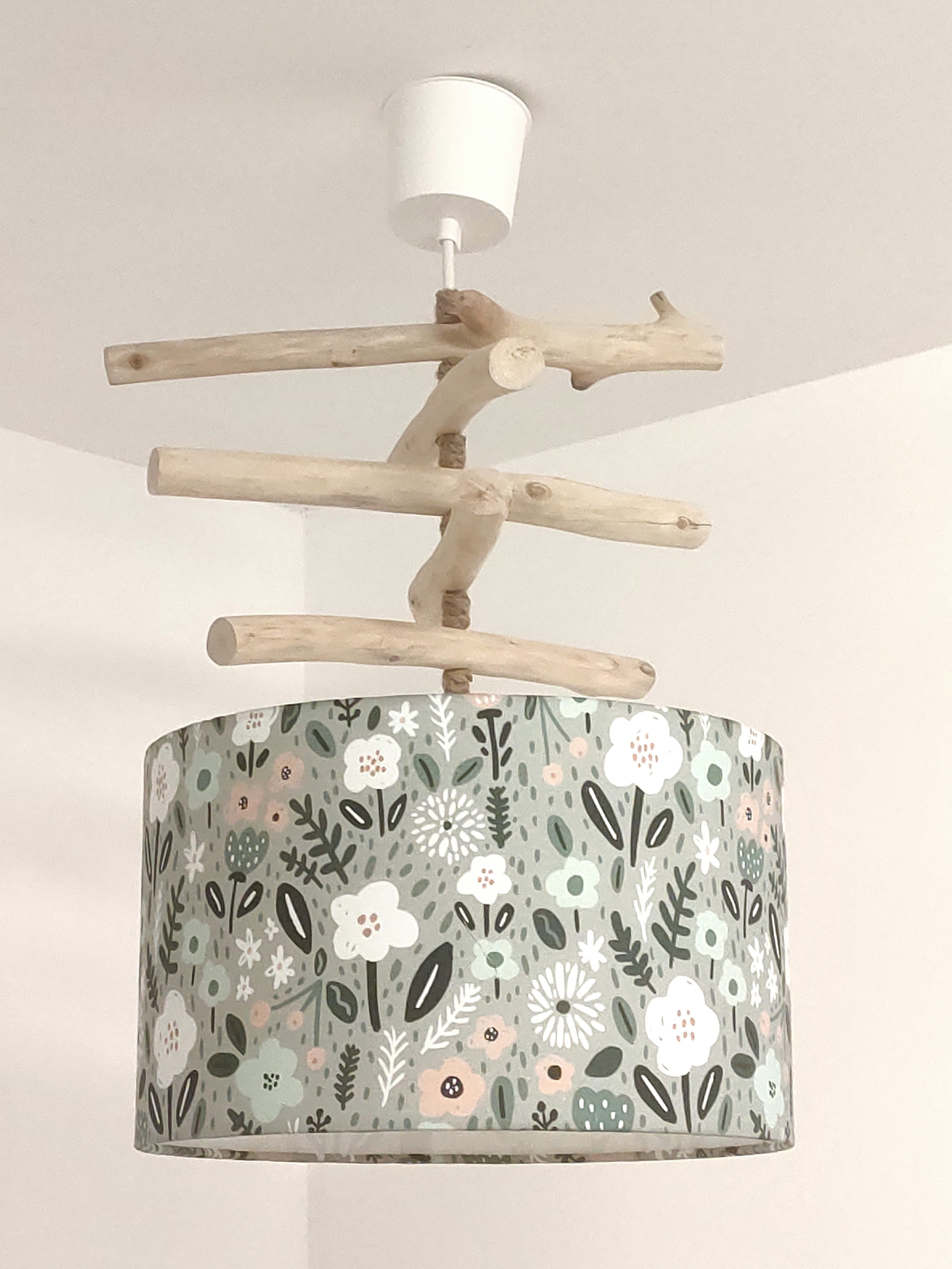 Création Artisanale Française - Lustre en bois flotté avec abat-jour cylindrique.