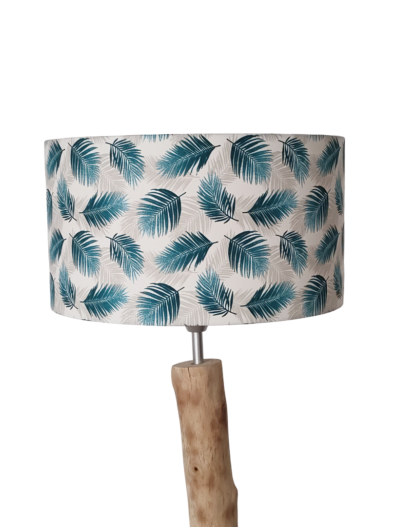 L’abat-jour est réalisé à partir d'une carcasse métallique finition époxy blanche recouverte de tissu 100% coton certifié OEKO TEX (sans produit chimique) motifs imprimés feuilles bleues contrecollé sur un polyphane ignifugé blanc (PVC non inflammable).