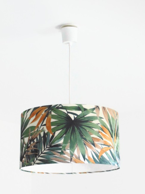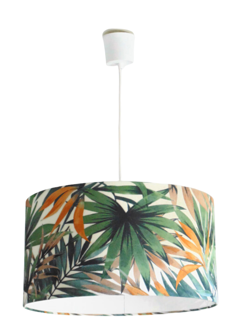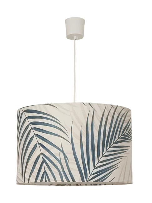 La suspension abat-jour est réalisée à partir d'une carcasse métallique finition époxy blanche recouverte de papier intissé imprimé motifs feuilles exotiques contrecollé sur un polyphane ignifugé blanc (PVC non inflammable).
