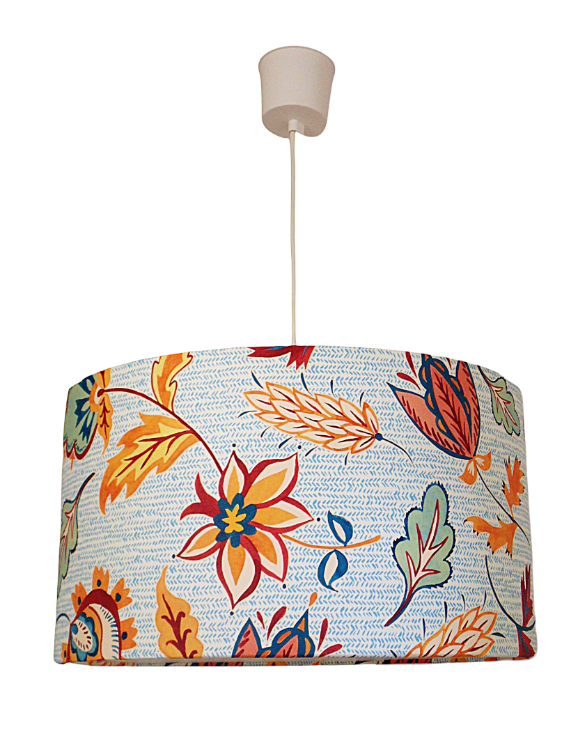 Ce luminaire trouvera facilement sa place dans toutes les pièces de votre maison à la décoration gaie, romantique et colorée avec ces jolis motifs fleurs et végétaux dans les coloris jaunes, oranges, rouges et bleus .