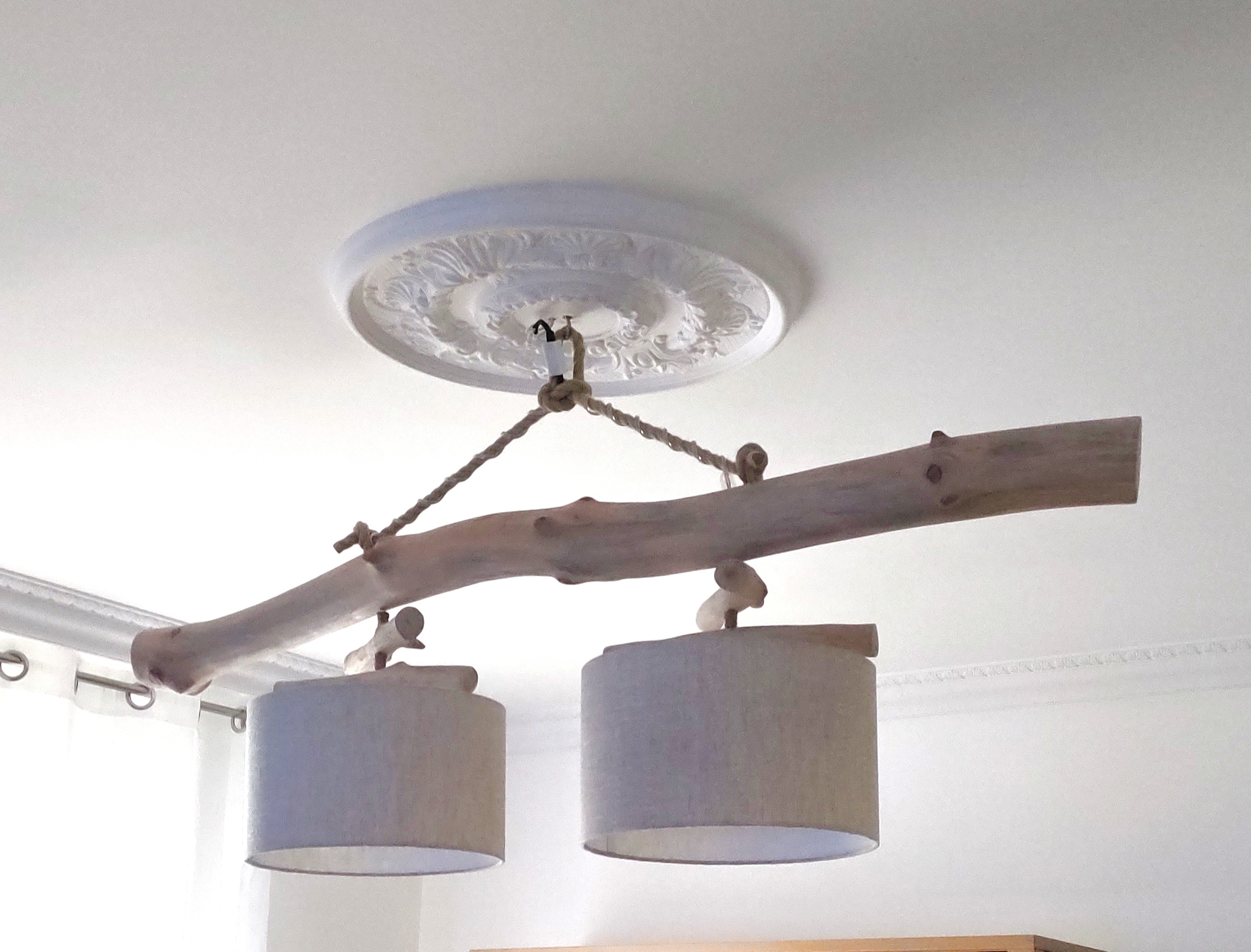 Création Artisanale Française - Lustre en bois flotté avec double suspension abat-jour en lin cylindrique.