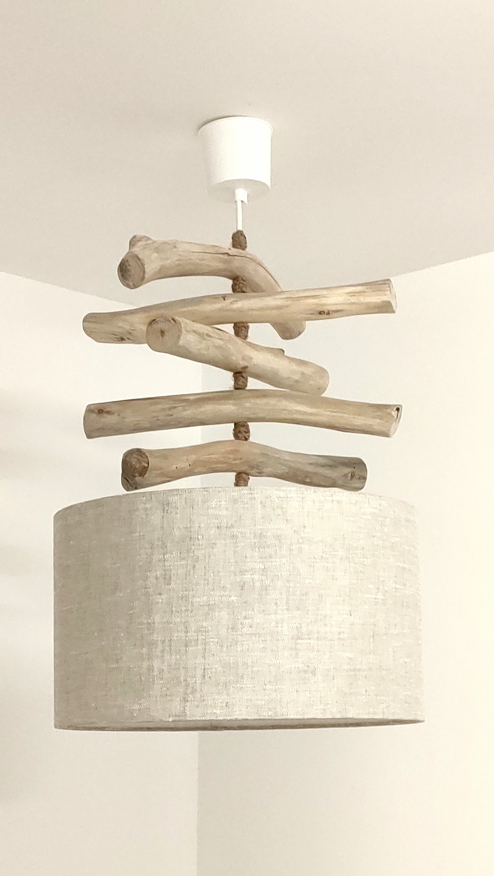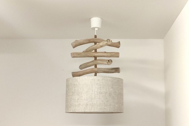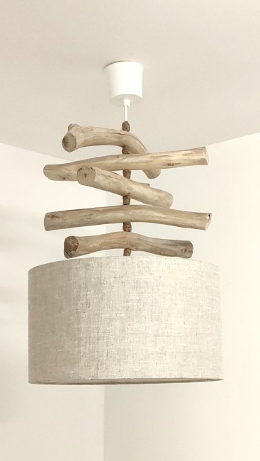 Création Artisanale Française - Lustre en bois flotté avec abat-jour cylindrique.