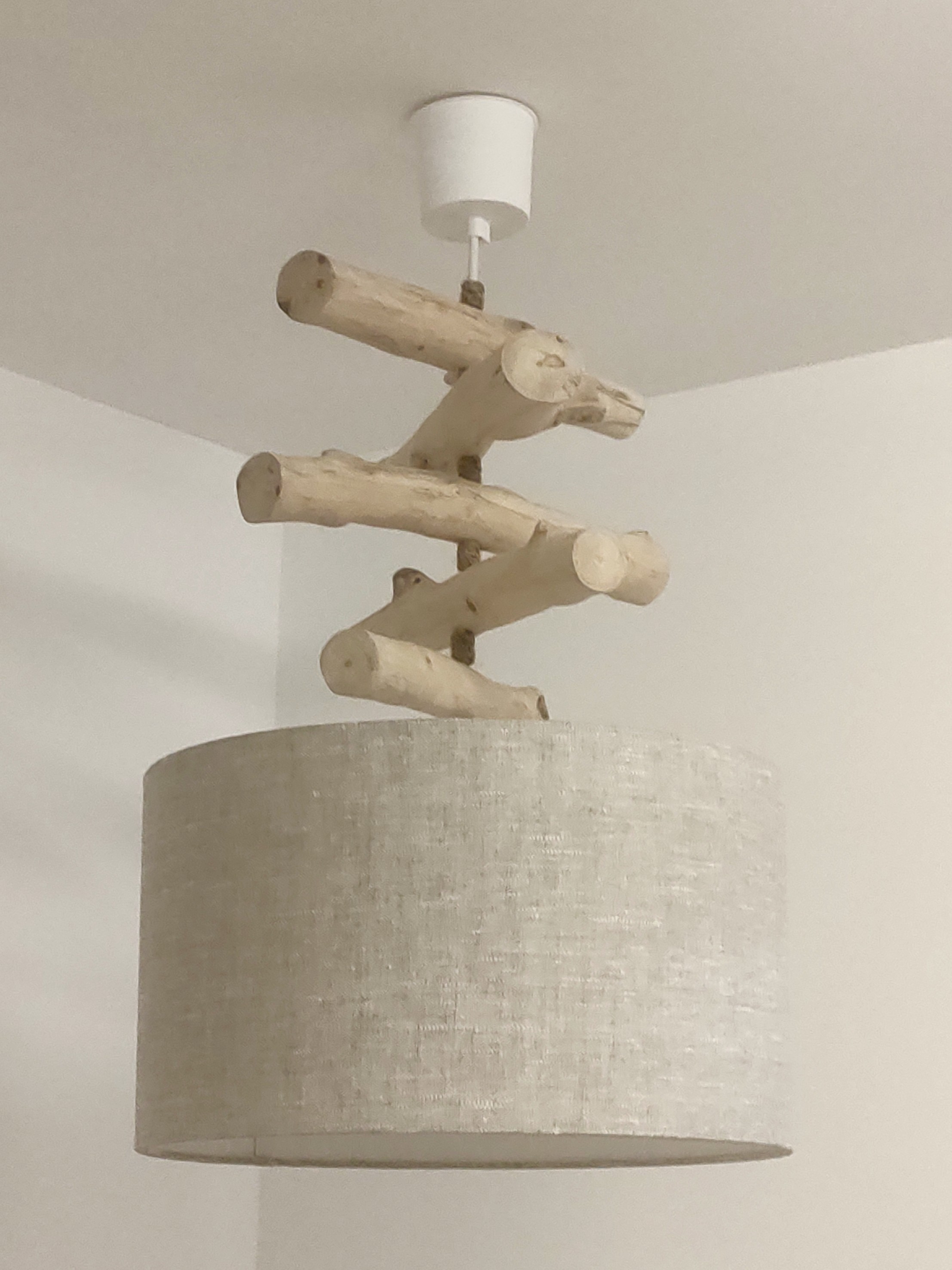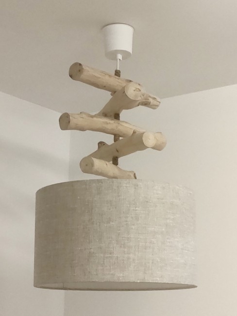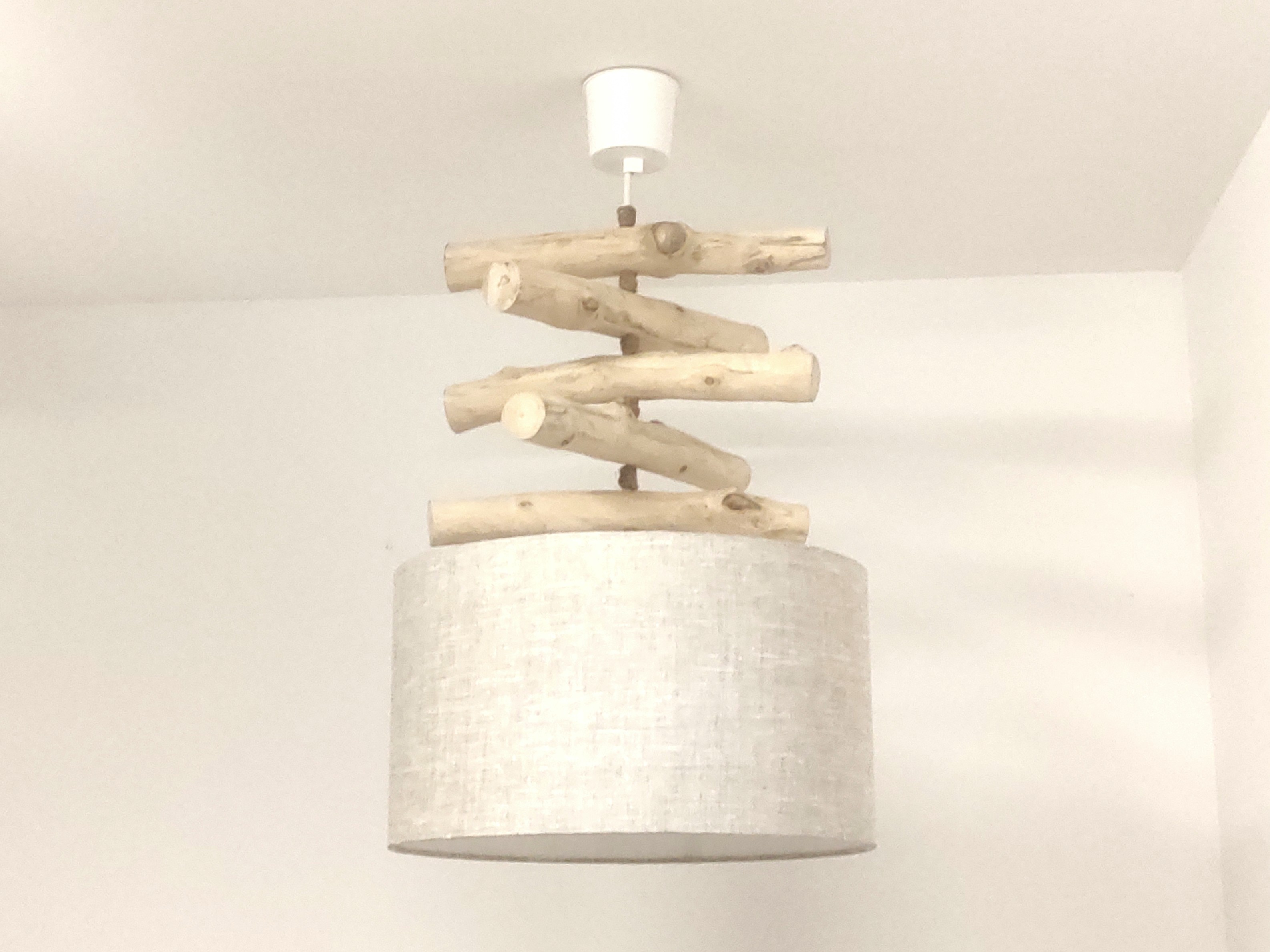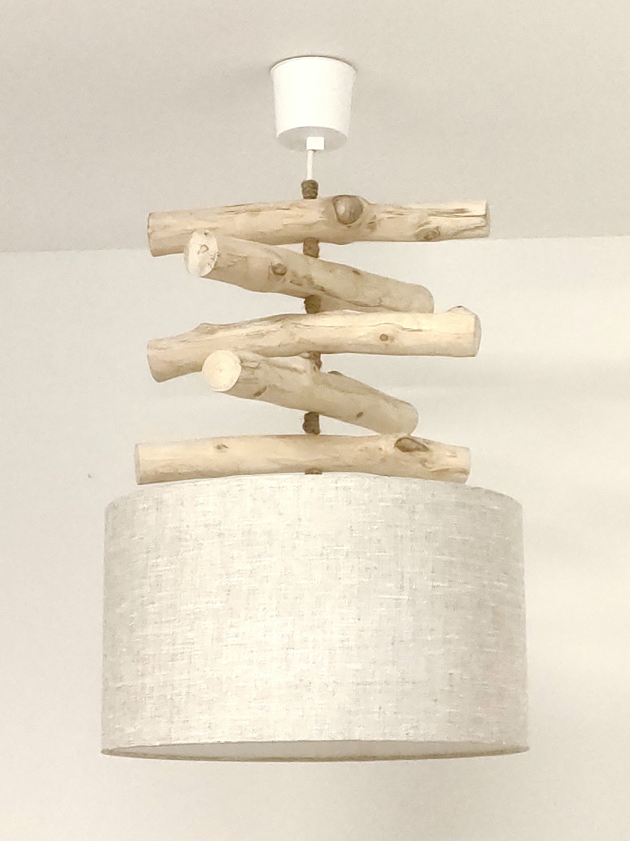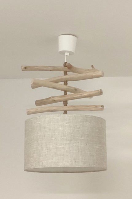 Création Artisanale Française - Lustre en bois flotté avec abat-jour cylindrique.